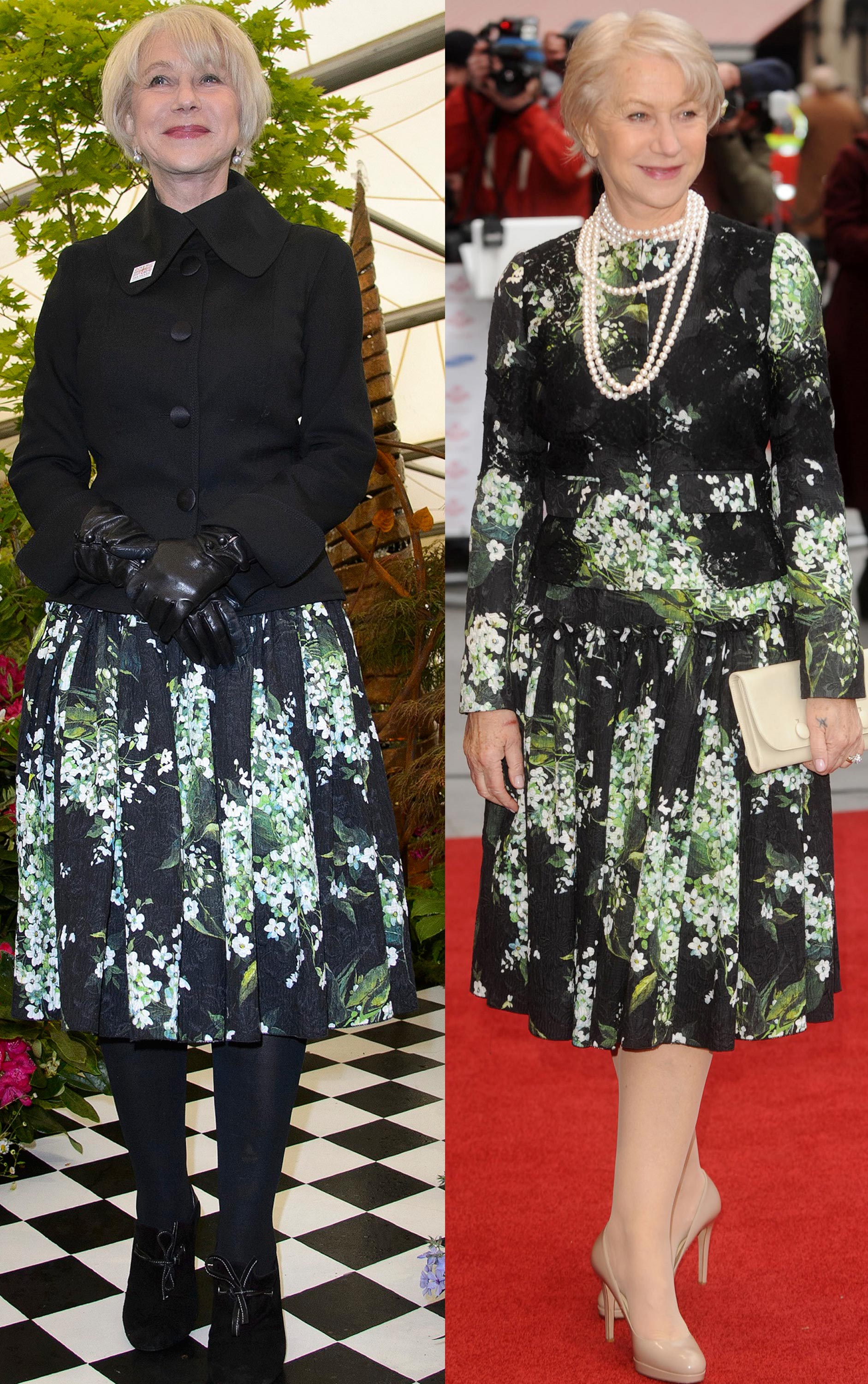 4. Helen Mirren, çiçekli elbisesi ile 26 Mart 2013 tarihinde Londra, İngiltere'de Odeon Leicester Meydanı'nda Prensin Güven Kutlama Başarı Ödüllerine katılırken aynı elbise ile 20 Mayıs 2013 tarihinde de Londra, İngiltere'deki Royal Hospital Chelsea'de Chelsea Flower Show basınına ve VIP önizleme gününe katıldı.