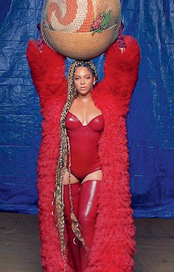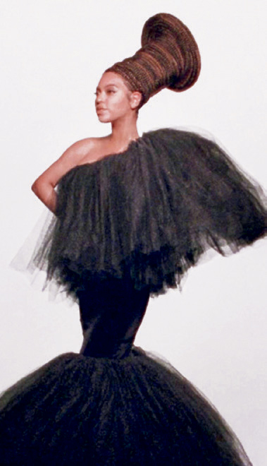 Queen B, Kongo’ya özgü ‘edamburu’ saç stiliyle sadece Mangbetu kabilesine selam göndermekle kalmadı, aynı zamanda yüksek statüyü sembolize eden saç stilini kraliçelere layık Timothy White tül elbisesiyle de harmanladı.