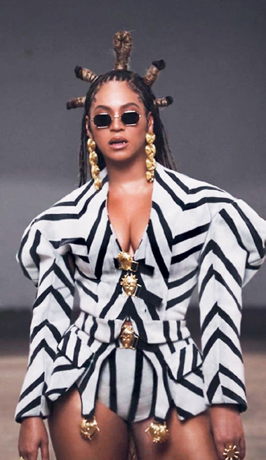 Geometrik kesim siyah beyaz ceketin tasarımı, Fildişi Sahilleri’nden Loza Maléombho’ya ait ve tarzını “Afrikalı kraliyet ailelerinin imajını yeniden yaratıyorum” şeklinde anlatıyor. Bölgenin etnik danslarından ilham alan koleksiyon ve Beyoncé’nin taşıdığı parça bir anda yılın en çok konuşulan görünümlerinden biri oldu. @lozamaleombho