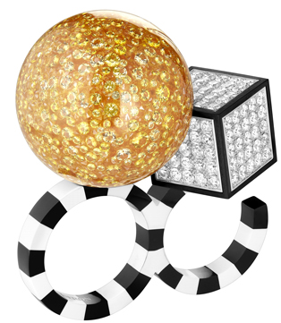 Koleksiyondaki olağanüstü hacimlere sahip, alışılmadık ve provokatif bir dengeye sahip havalı yüzükler hem teknik hem de görsel olarak olağanüstü geometrik uyum içindeler.