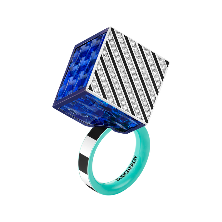 Koleksiyonun dikkat çeken parçalarından olan bu yüzükte, hassas bir şekilde yerleştirilmiş sarı elmas ve safir kürenin yanında bir kristal kaya ve beyaz altın küp titanyum ile çerçevelenmiş.