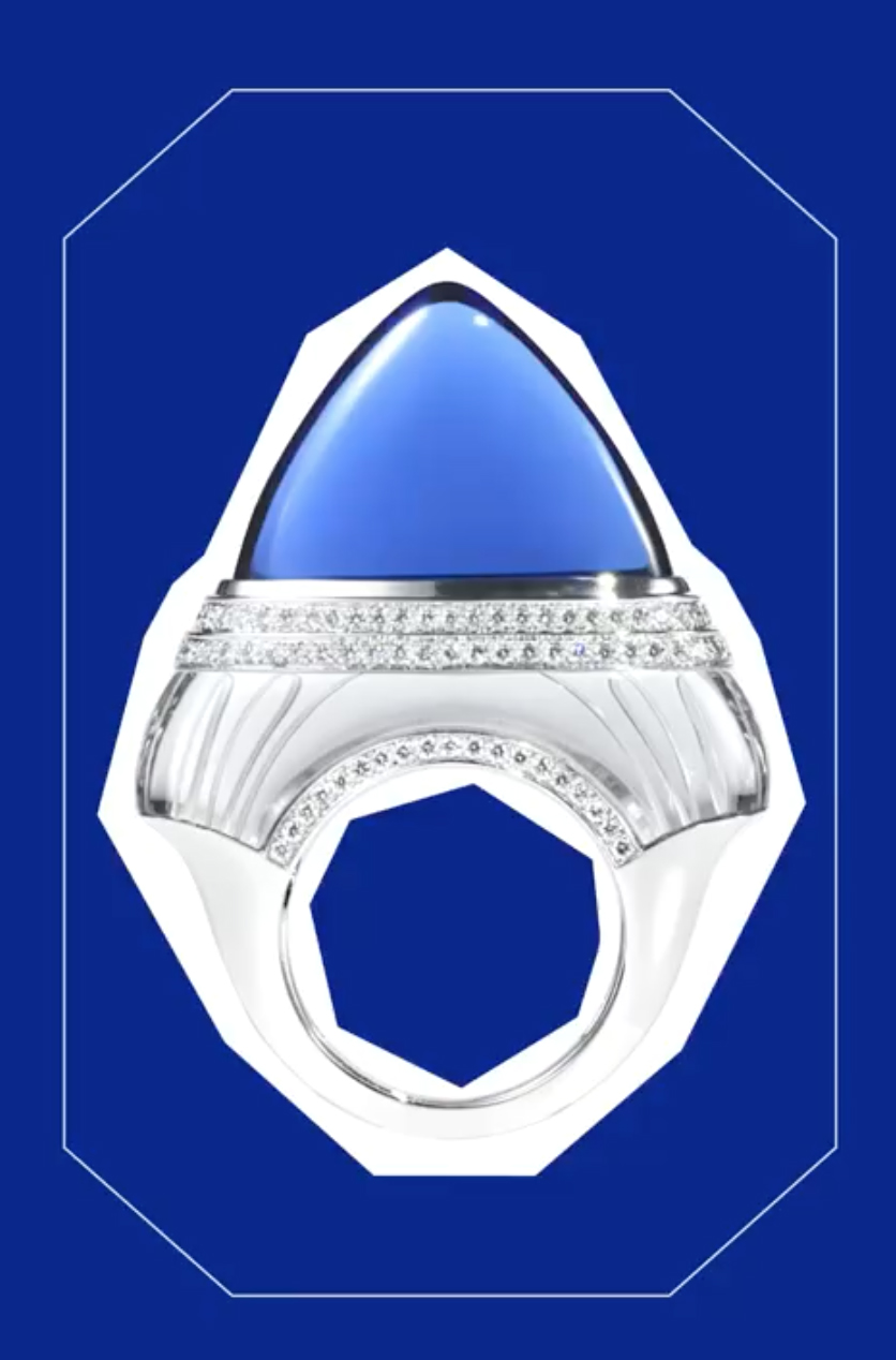 Cabochon tanzanit, elmaslardan, kaya kristalinden yapılmış 33,15 karat olan bu “Parfüm Yüzük”, Boucheron'un sanat ve zanaatı birleştirme becerisini kanıtlar nitelikte…