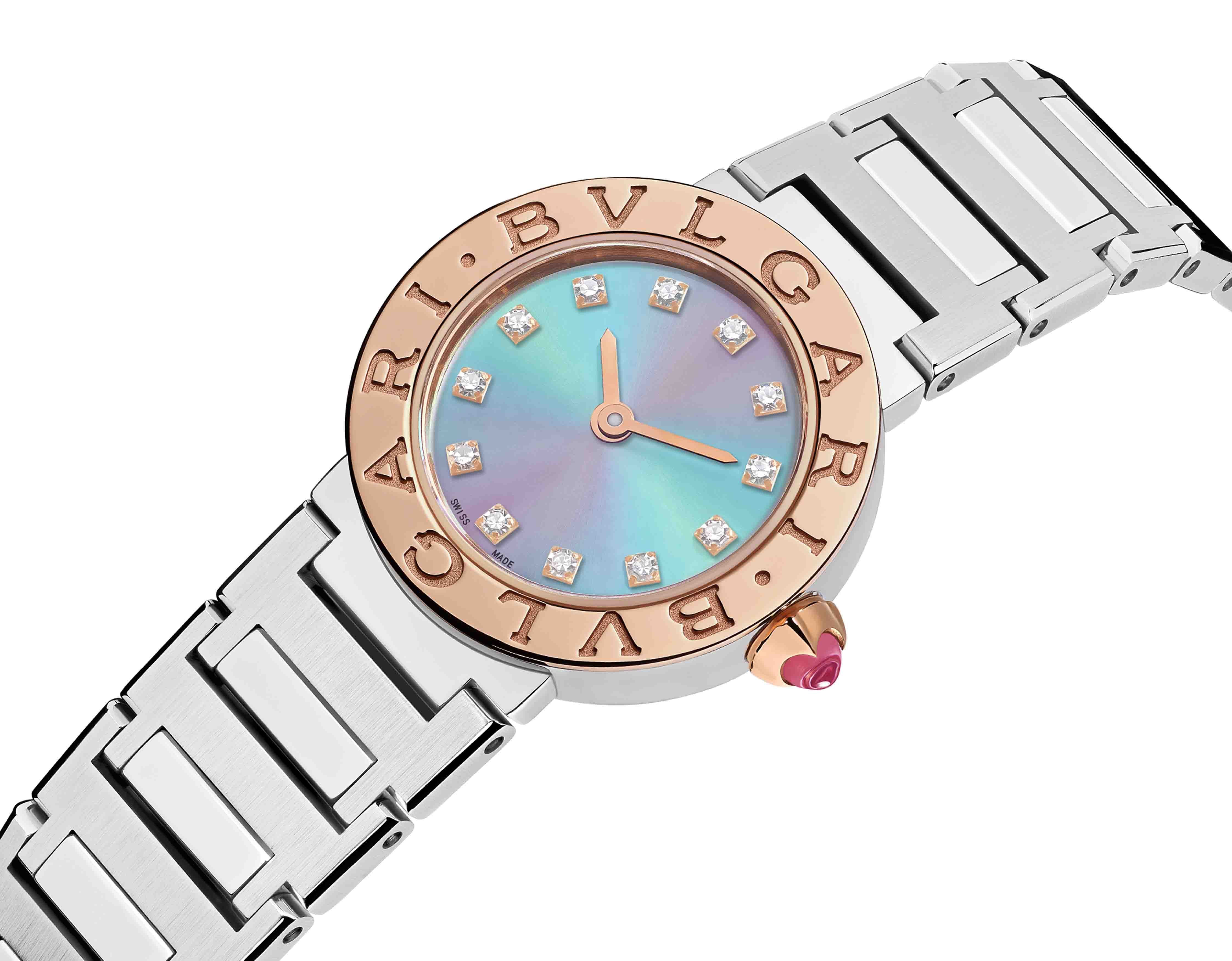 BVLGARI BVLGARI harfleri, pembe altın olarak saatin üstündeki kristalı tutan çerçevede iddialı bir şekilde yer alırken kadranda kararlı bir minimalizm kendini gösteriyor. Saf ve doğal rengi – yeşil, mavi ve belki ince bir mor dokunuşu – Bulgari tarafından LISA için özel olarak geliştirildi. Bu ton, ışığın kadrandaki güneş ışını motifine temas etmesiyle hafifçe değişiyor ve LISA gibi şaşırtıyor. On iki pırlanta saat imi ve pembe altın akrep ve yelkovan bu göz alıcı yanardöner kadranı süslüyor. Aynı derecede değerli pembe altın kurma tepesi de Bulgari’nin estetik imzalarından kaboşon kesim rubelit ile tamamlanıyor.
