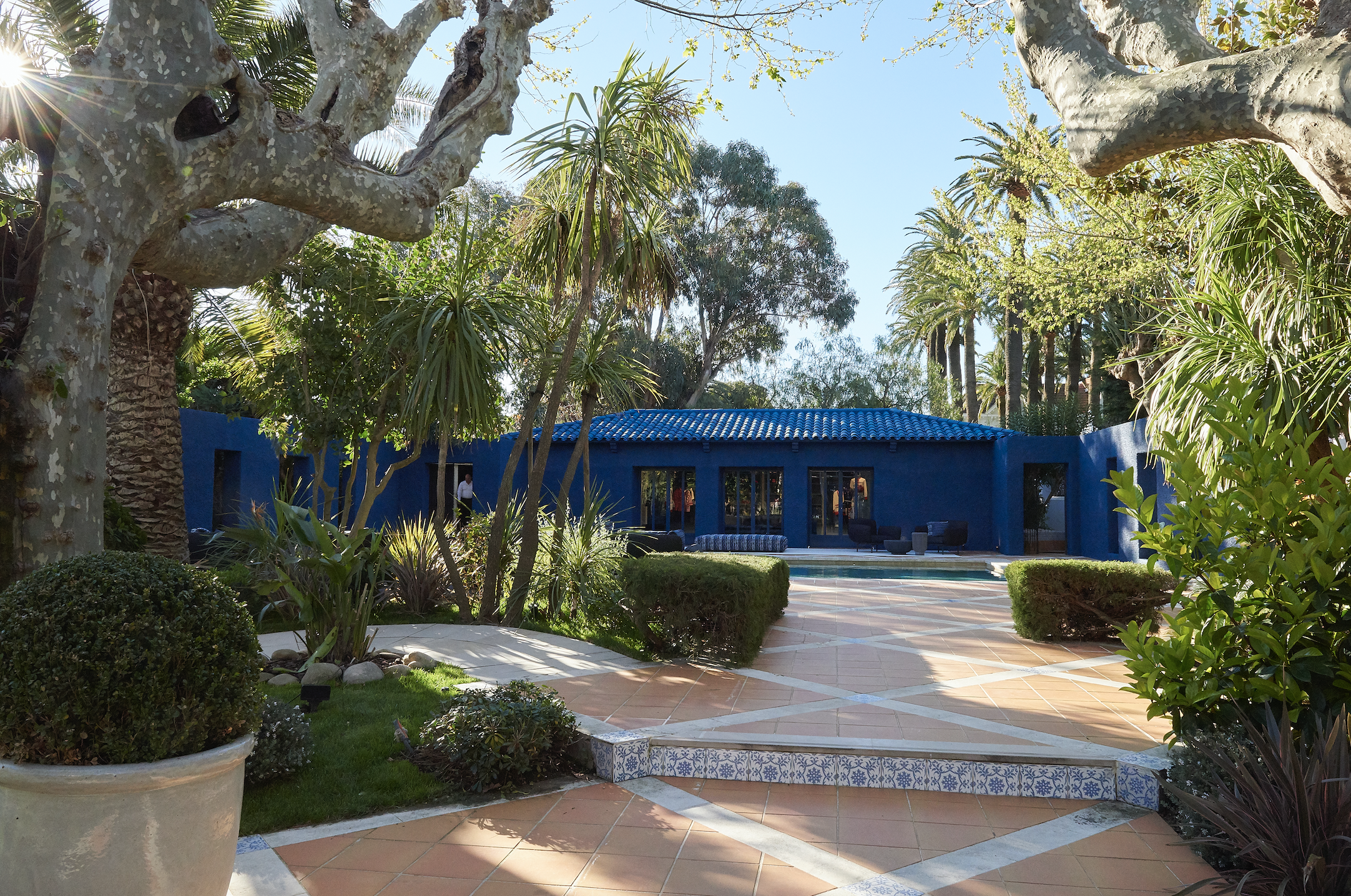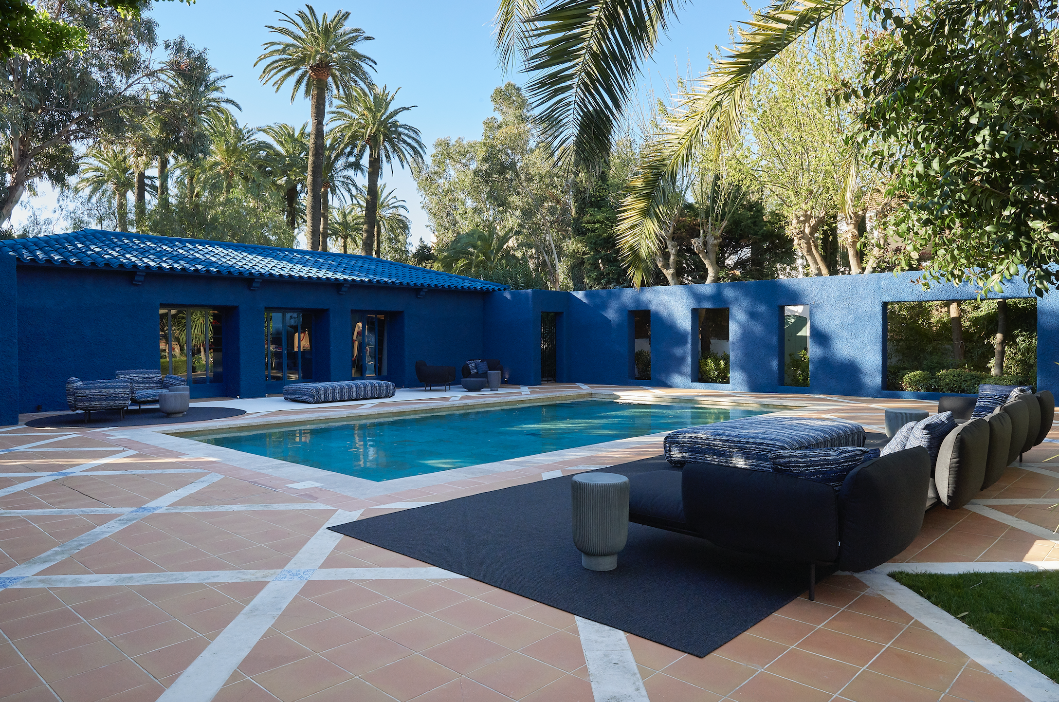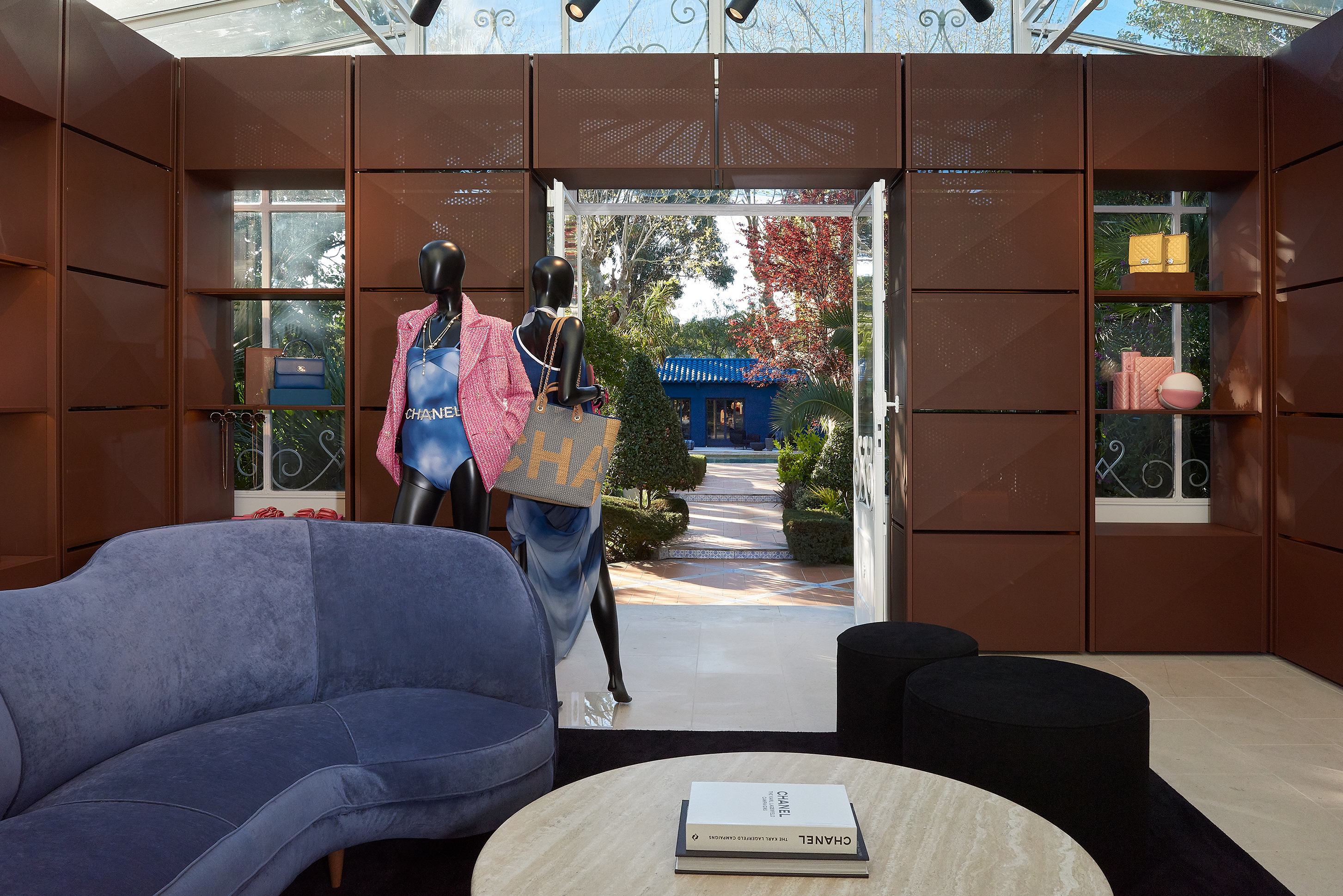 La Mistralée’nin bahçesindeki havuzun kenarlarına yerleştirilen siyah ve beyaz halılar huzurlu ve keyifli bir alışveriş deneyiminin son dokunuşlarını yapıyor. Lacivert, beyaz ve siyah tüvit puflar ve minderler yaz tatili ambiyansını yaratırken, parlak mavi boyanan havuz kulübesi Akdeniz tatilini yansıtıyor. İçeri girdiğiniz zaman, reçine masalar ve parlak mobilyalar ile karşılacağınız bu havuz kulübesinde, Chanel’in Coco Beach de Chanel koleksiyonundan mayoları, espadrilleri ve hasır aksesuarları inceleyebilirsiniz…
