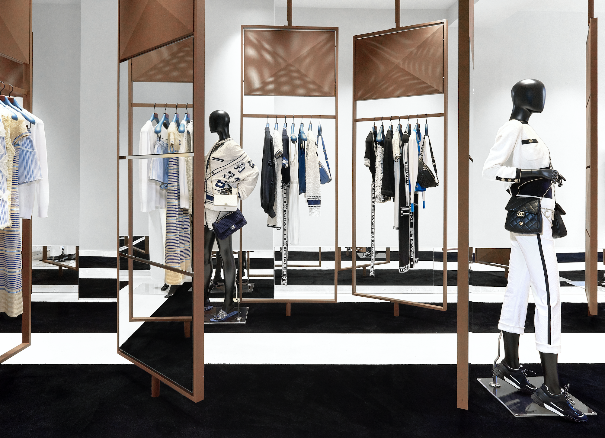 Bu sezon için klasik iç mimari tasarımları, ultra modern mobilyalar ile dekore etmeyi tercih eden Chanel, bej renkli traverten döşemeli zemin ile ziyaretçileri ağırlıyor ve butiğin farklı yerlerinde her adımda onlara eşlik ediyor. Antik aynalar ile görsel bir bütünlük sağlayan butiğin kırık beyaz duvarları ve siyah halısı, Chanel’in imzası olan siyah ve bej rengini yansıtıyor.