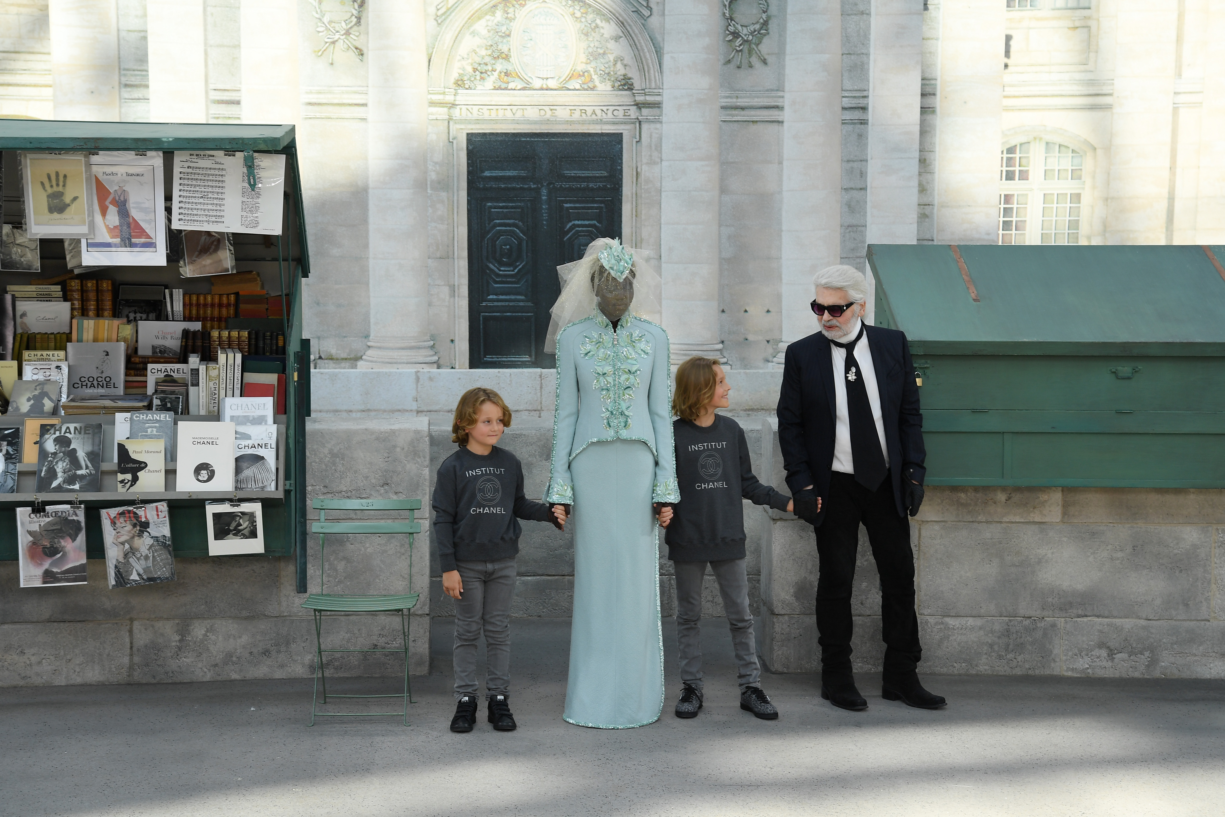 Lagerfeld Sonbahar Kış 2019 Couture Koleksiyonu için bu sefer de Paris sokaklarını defilesine taşıdı. Otantik kitapların ve dergi standlarının etrafında yürüyen modeller adeta Seine nehrinin kenarında yürüyor gibiydi. Sahnedeki metal sandalyelerde oturan sekiz yaşındaki Hudson ve Jameson Kroenig ikizleri, Lagerfeld’in en sevdiği erkek modeller.