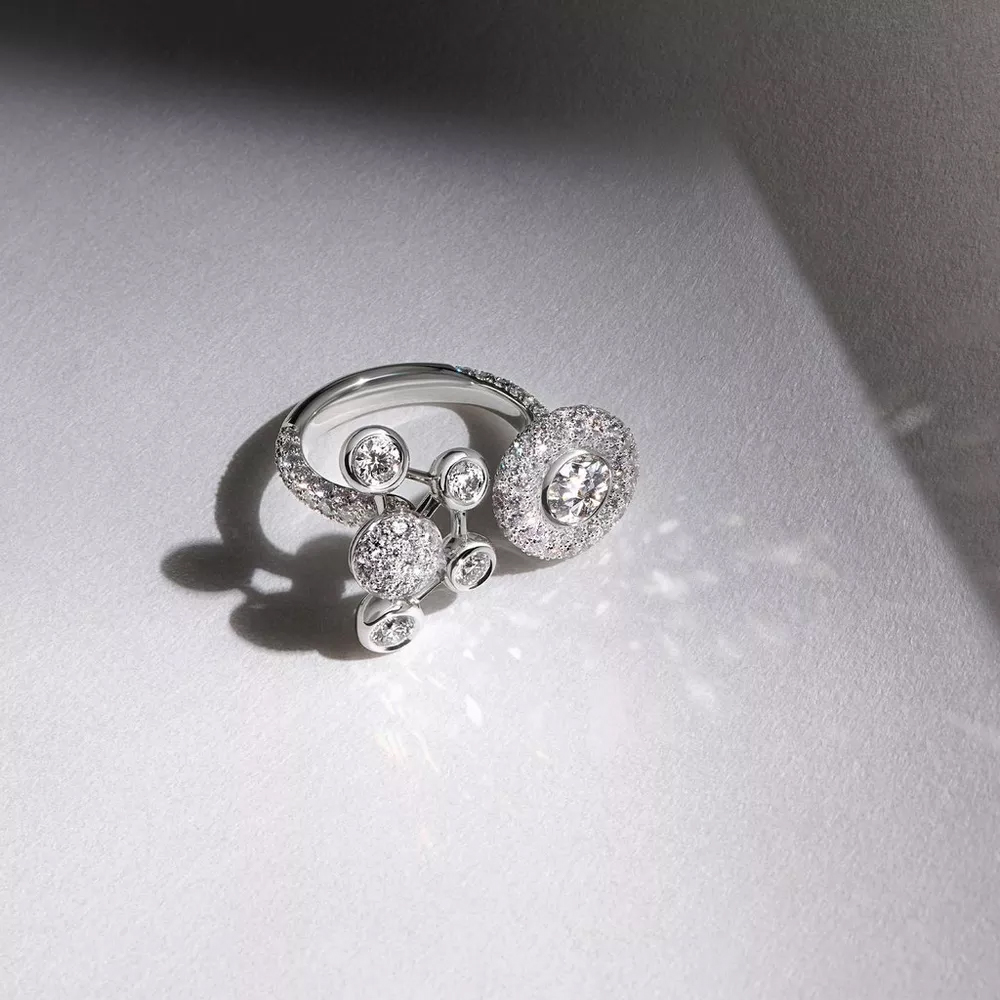 Bir elmasın içyapısının üstün güzelliğinden ilham alan bu eşsiz “Atomique Double Yüzük”, De Beers’ın efsanevi elmas uzmanlığının, yaratıcı yeteneğinin ve mükemmel işçiliğinin doruk noktasıdır. Açık tasarımıyla, iki zıt motif arasında atomik bir çekim yaratmış.