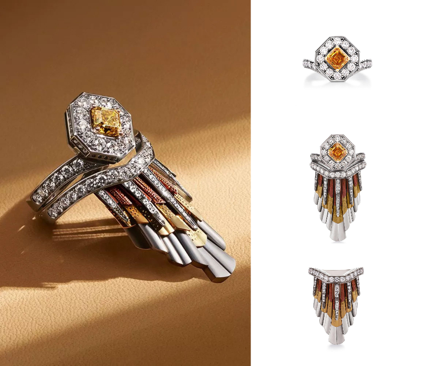 Sarı, turuncu ve bronz tonlarını hâkim olduğu “Işık Işınları” bölümü, günışığında bulunan daha sıcak renklere çağrışım yapıyor. Siyah rodyum kaplama altınla kontrast oluşturan parlak beyaz pırlantalar, De Beers imzası olan işlenmemiş ve işlenmiş elmasları renkli titanyum ile birleştirmiş. Mükemmel bir kendine özgülük…