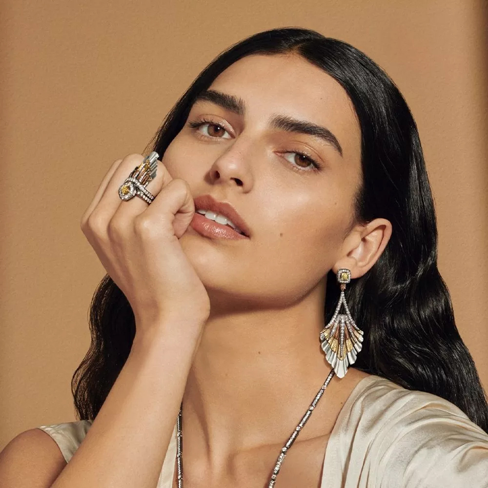 Dönüştürülebilirliğin harika bir örneği “Fringe Küpeler”… Bulutların arasından süzülen güneş ışığından esinlenen bu hareketli küpelerin, püskül bölümü çıkarılabiliyor ve böylece daha klasik görüntüsü ile de kullanılabiliyor. Hem drama hem de çok yönlülüğün özü olan çarpıcı 7.78 karat küpeler için toplam 155 etik kaynaklı, elle seçilmiş pırlanta birleştirildi.
