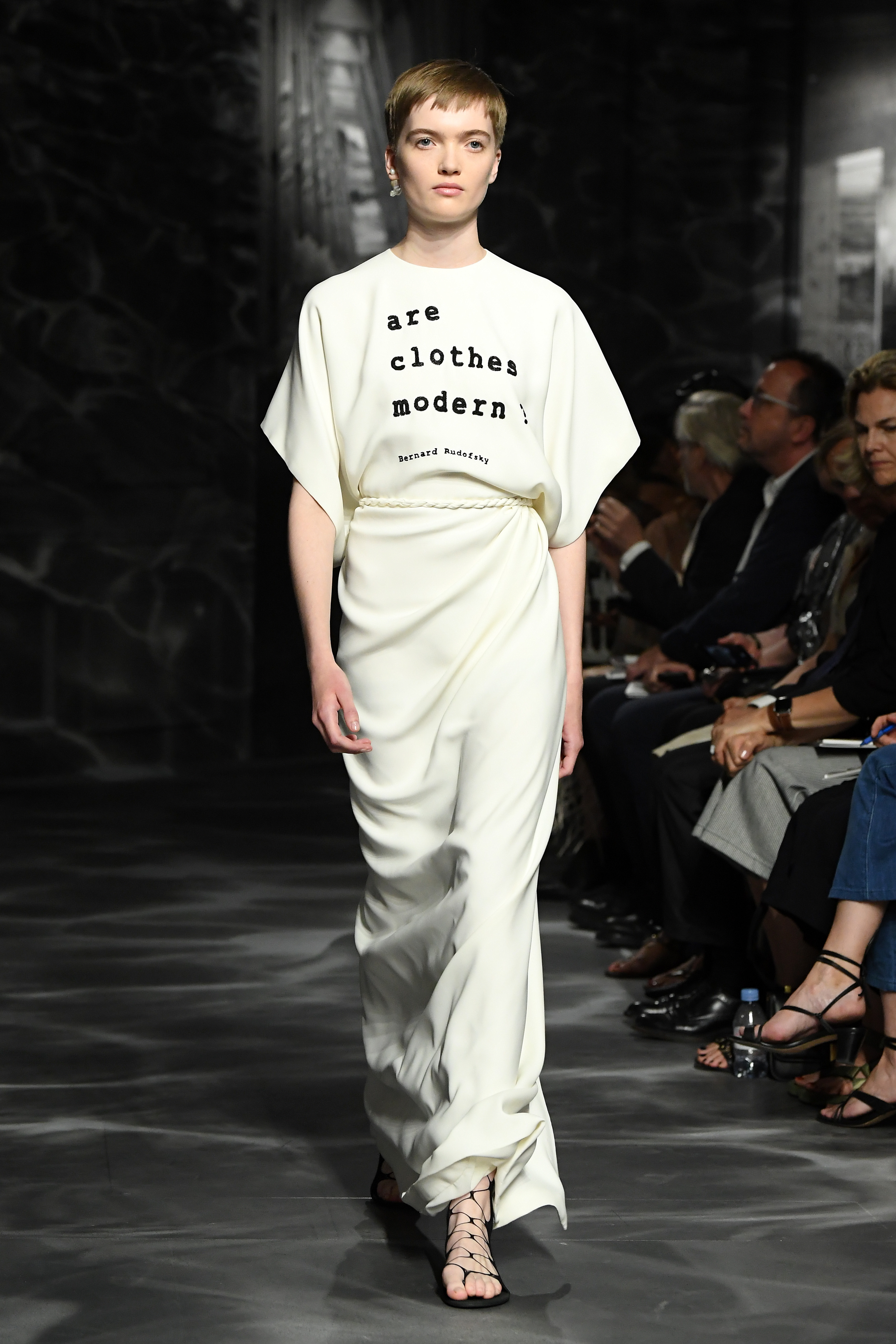 Dior’un Paris’teki 30 Avenue Montaigne’daki atölyesinde çiçekli bir arka planda gerçekleşen defilenin açılışını üzerinde “Kıyafetler modern mi?” yazan bir tişört giyen model yaptı. Gladyatör esintili kıyafetler giyen modeller, gotik romantik temalı koleksiyonu gösterirken, kabarık etekli elbiseler ve korseli tasarımlar izleyenleri büyüledi.
