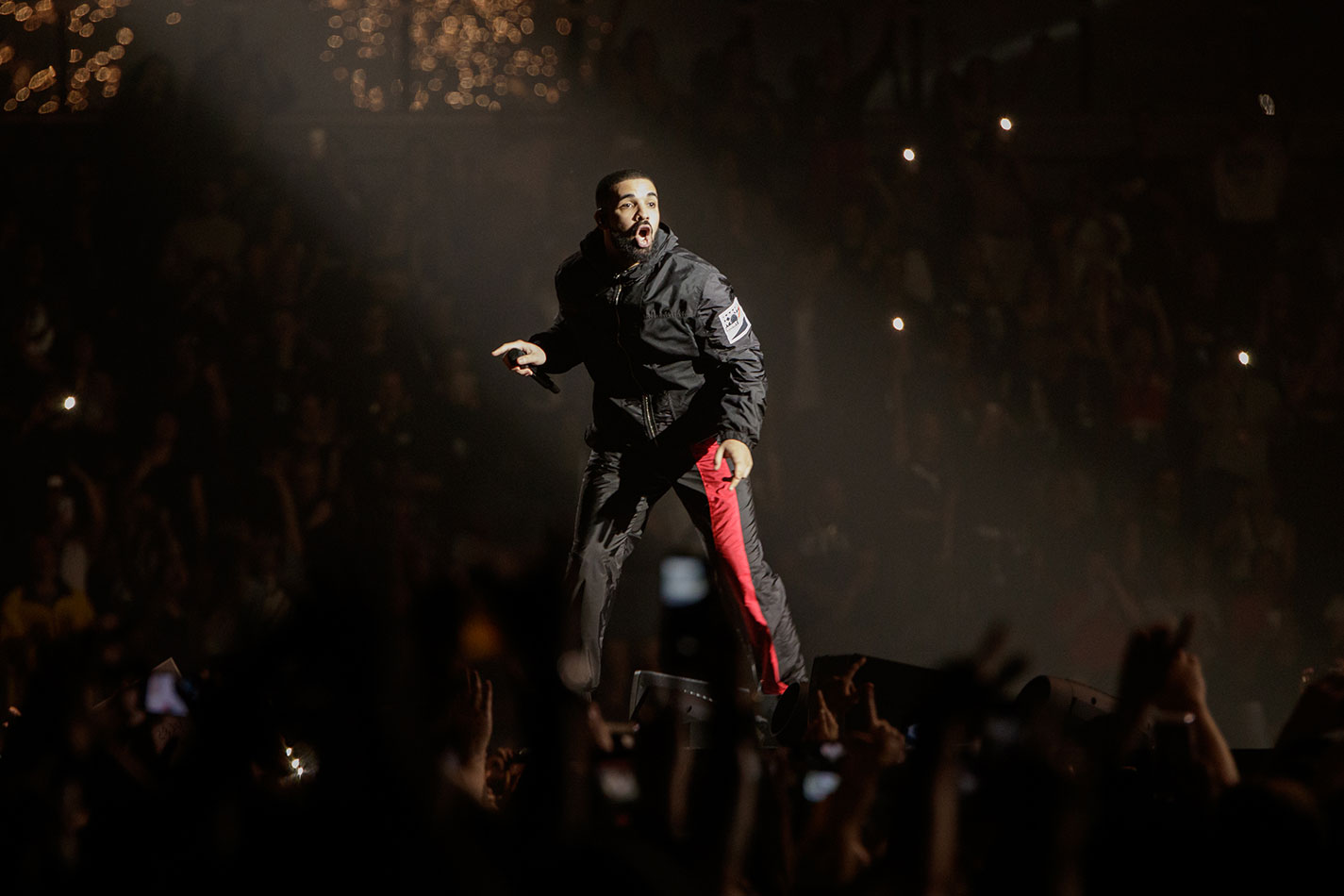 Drake, özel tasarım Prada kıyafetleri ile sahnede.