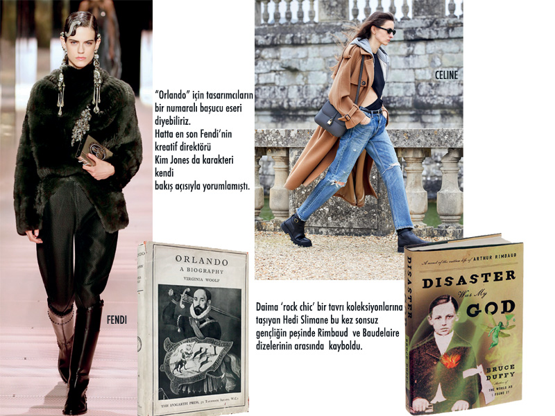 Tasarımcıların referans almaktan en çok hoşlandıkları eser, yazar Virgina Woolf’un “Orlando”su. Nedeni ise geçtiğimiz 10 sene boyunca tasarımcıların artık cinsiyet kalıplarından uzaklaşmaya başlaması. Bu kış, Kim Jones Fendi için ilk couture koleksiyonunu sunduğunda, daha önce Burberry için tasarlayan Christopher Bailey, Ann Demeulemeester, Rei Kawakubo hepsi de “gender fluid” koleksiyonlarının referansı olarak Orlando’yu gösteriyordu.