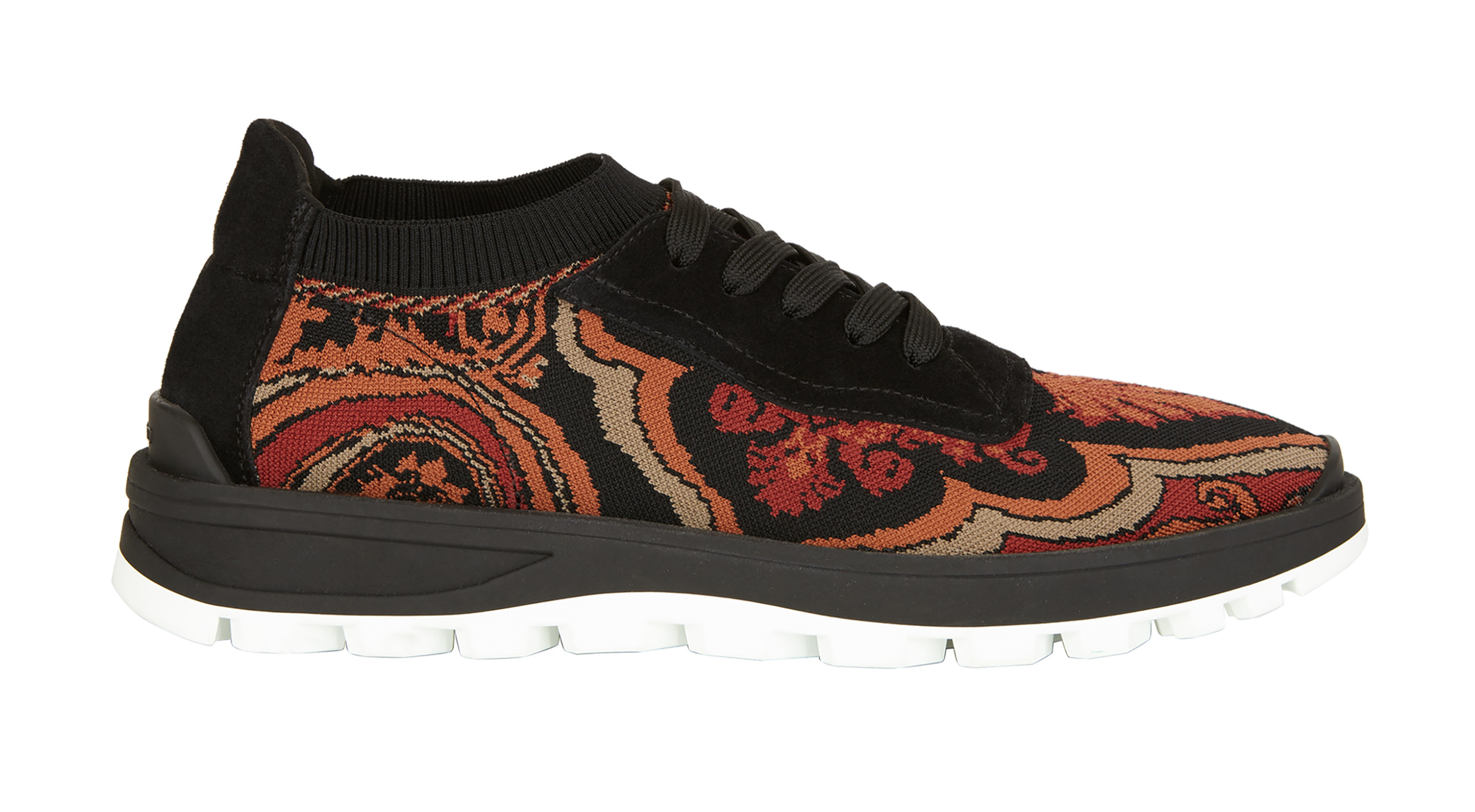 Etro’nun arşivindeki şal desenli jakar kumaştan erkekler için bağcıklı, kadınlar için çorap şeklinde hazırlanan Etro Paisley Run sneakerlar, canlı renkleriyle dikkat çekiyor.