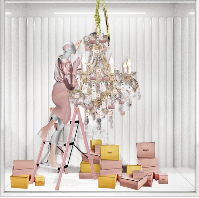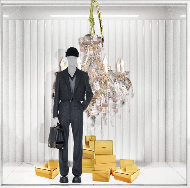 Palazzo Fendi, tam olarak kutlama ruhunu yansıtan vitrinleri Romanın kalbinden Tokyo Ginza 6’ya, Paris Avenue Montaigne’a, Hong Kong Landmark’a ve Canton Road’a taşıyor. İkonik çam ağacı dekorunu güncelleyen Fendi, ‘Chandelier’ konsepti için Fendi Roma Holiday kampanyasının hacimli ışık detaylarından ilham alıyor ve böylece neşe ve pozitiflik mesajını paylaşıyor. Murano cam avize, Mazzuccato adlı Murano adasında yerel bir zanaatkarı ayakta tutan, cam işçiliğinin değerli el yapımı uzmanlığını koruyan ve İtalya'daki kilitlenme sırasında bazı zorluklar yaşayan eşsiz bir projeden doğuyor. Müşteri talebinin olmaması ve sipariş iptalleri nedeniyle stokta bırakılan 37 üretilmiş Murano Avizesini satın alan Fendi, bunları parçalara ayırarak 17 özel ve alışılmadık derecede sıra dışı dev avizeler yaratıyor. Gelenek ve modern teknolojiyi birleştiren klasik Murano şekli, keskin ve modern bir Fendi Avizesi oluşturuyor. Roma Palazzo Fendi, Londra New Bond Street, New York Madison Avenue, Paris Avenue Montaigne, Şangay Plaza 66 olmak üzere Dünya çapında beş butik penceresini dekore etmek için yaratılan bu avizeler, diğer butiklerde ise metal ve kristallerden oluşan temalar ile aynı ruhu sergiliyor.