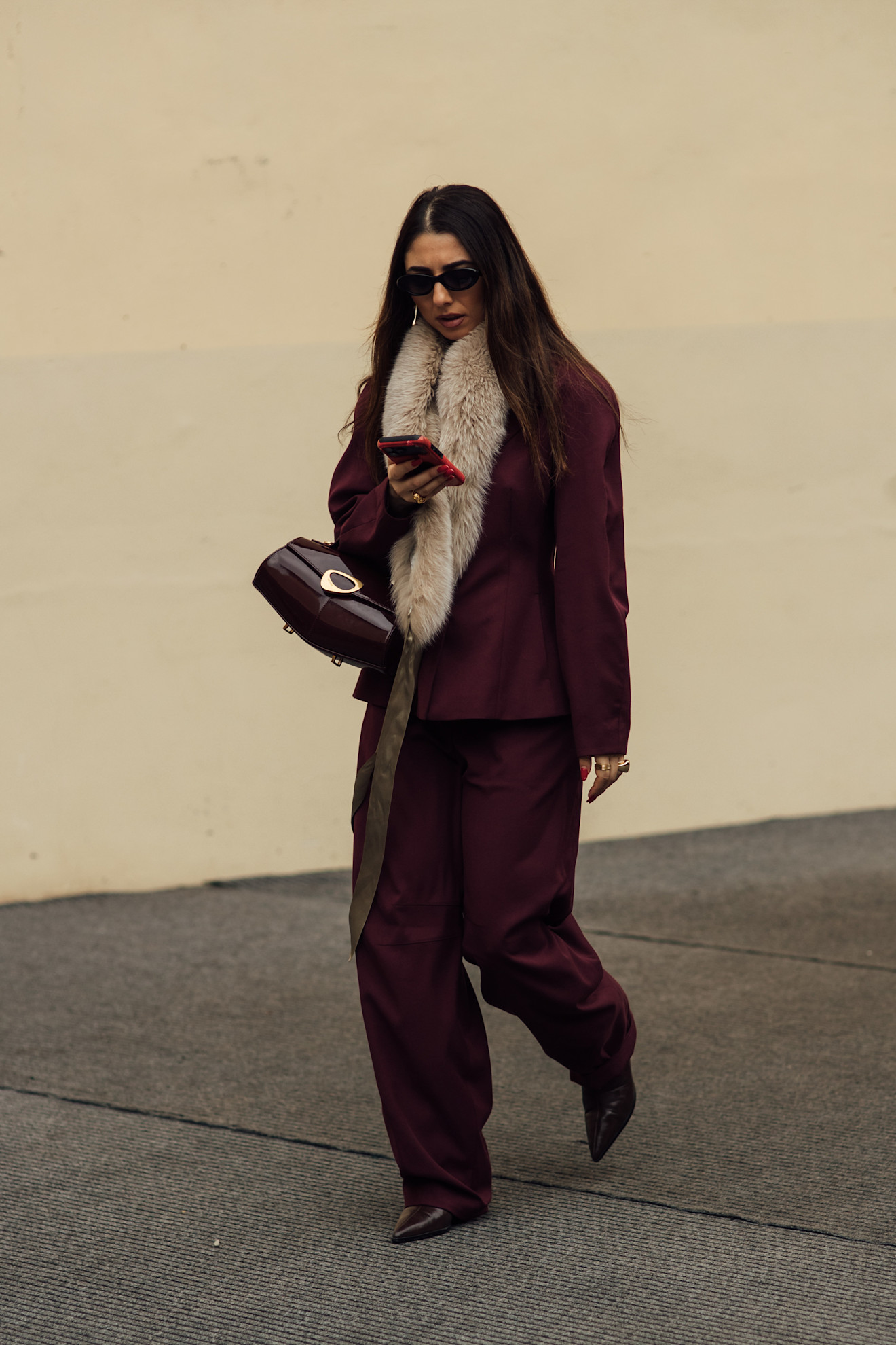 Pitti Uomo’da maskülen dünya ön planda olabilir ama kadınlar da kendi özgün stilleriyle bu podyumun en güçlü aktörleri arasında. Şehrin serin havasına eşlik eden derin bordo görünümler, kalabalıklar arasından sessiz ama çok güçlü bir şekilde sıyrılıyor.