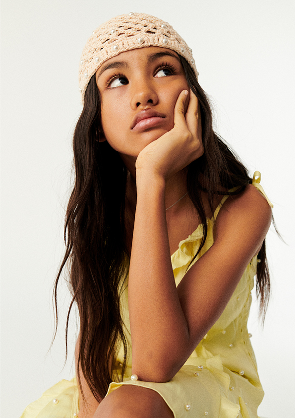 Parıltılı modanın büyüsü, gündelik elbiseleri ve sokak kıyafetlerini kilit görünümlerle birlikte, kumlu pembeler ve açık mavilerden oluşan rüya gibi bir palette yeniliğin büyüsüyle buluşturuyor. Fırfır ve inci süslemeli panellere sahip, tozlu sarı bir elbisenin yanı sıra, elmas ve inci kesimli mavi elbise de, genç ve romantik kalpleri kazanacak. İncilere damlayan tığ işi iki parça ise plaj giyimini sevenleri memnun edecek. İnci detaylı overisized denim, astroloji baskılı üstler ve kolyeler ile boncuklu mini çanta kız topluluklarına sıra dışı bir enerji katacak.