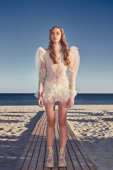 Monet’nin pitoresk bahçesinden yansıyan çiçek figürleri; lazer kesim parçalar çok katmanlı bir hale getirilerek yoğun floral görünümlerle koleksiyonda hayat buluyor. Göz alıcı mini elbiseler, gösterişli maksi elbiseler, kesik detaylı tulumlar, reform edilmiş kargo pantolonlar; zengin fırfırlar, işleme ve parıltı ile bir araya getirilerek SS22 “Soigné” koleksiyonu tamamlanıyor.