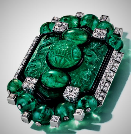 Hiç şüphesiz bu broş, oymalı zümrüt kullanımının en güzel örneklerinden biridir. Jacques Cartier, 20. yüzyılın başlarında zengin maharajalara satış yapmak için Hindistan'a gittiğinde, oymalı değerli taşları bu broş gibi önemli Art Deco mücevherlere uyarladı. Metropolitan Sanat Müzesi, Victoria ve Albert Müzesi, Paris'teki Grand Palais'te sergilenen broş; Haziran 2019'da Christie's Maharajas & Mughal Magnificence satışında 1,45 milyon dolara satıldı.