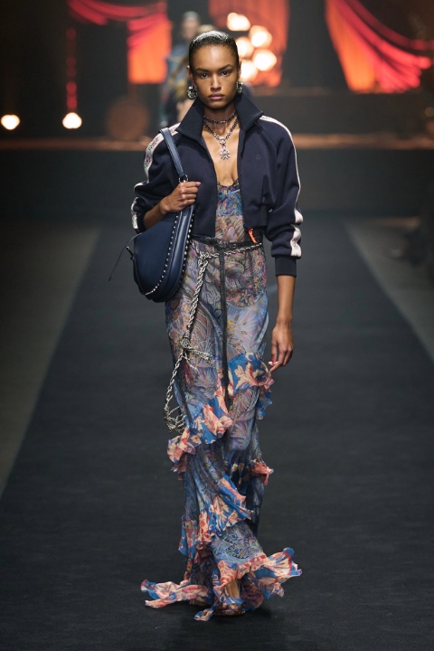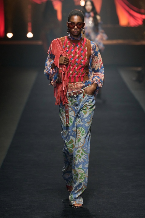 Koleksiyonda canlı ve yoğun desenler püskül ve volan detaylarıyla birleşerek sürekli bir hareket hissi yaratıyor. Renkli deri işçiliğiyle güncellenmiş ceketler Etro’nun bilinen stiline yeni bir yorum getiriyor. Metalik takımlar hacimli bluzlarla kontrast kurarken bol kesimli ve baskılı denim parçalar koleksiyonun rahat ve yaşanabilir doğasını öne çıkarıyor.