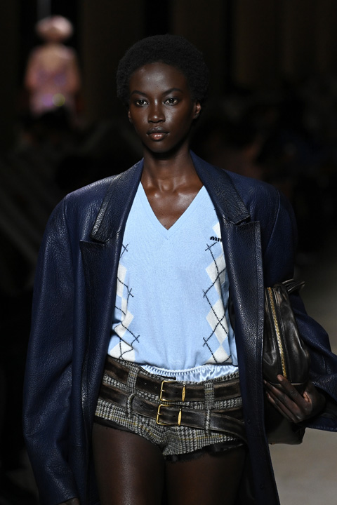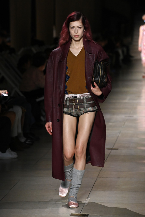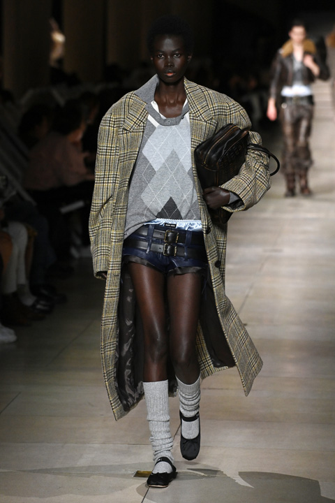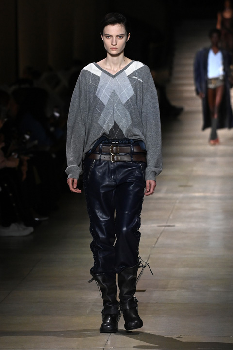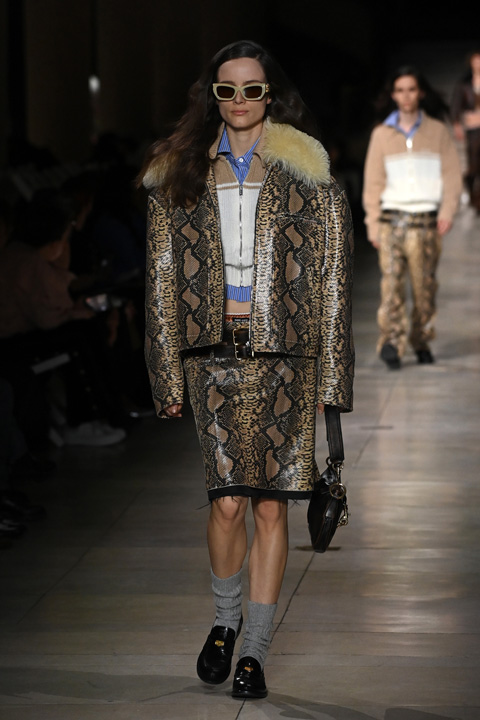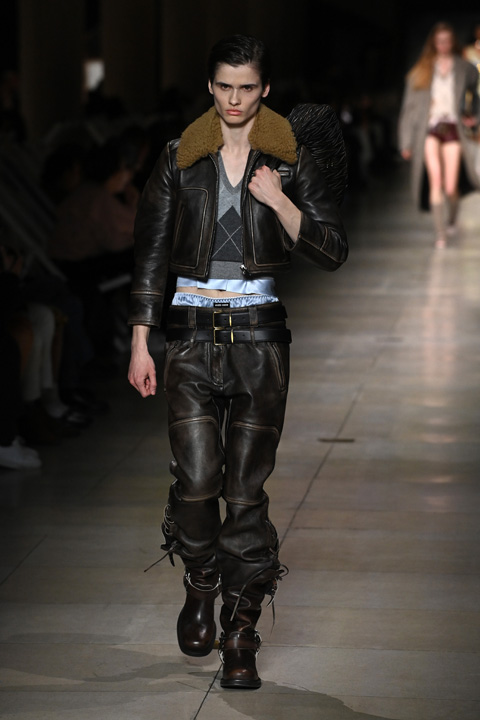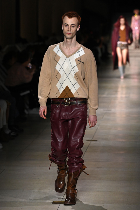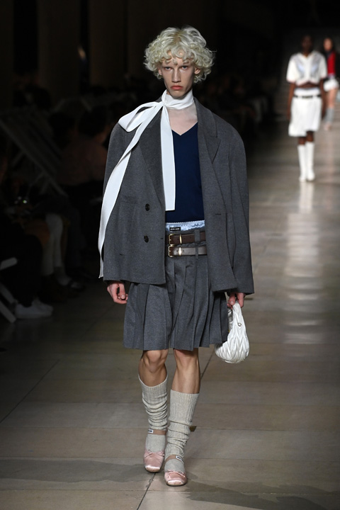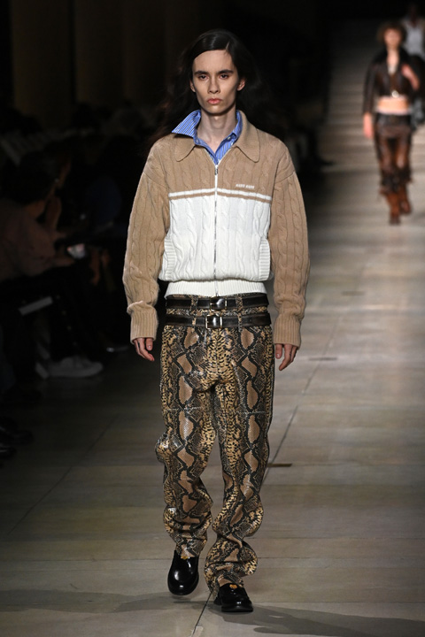 Aynı tema, yeni varyasyonlarda (yılan derisi baskılı, lekeli deri, suni kürk yakalı) ortaya çıktıkça, Miu Miu kişisinin cinsiyet açısından daha çeşitli bir ifadesi şekillendi. Her moda kızı ve annelerinin yanı sıra, erkekler de geçen sezonun kırpılmış Miu Miu örgüleri ve küçük ceketleriyle şova girdi. Miu Miu'nun feminen estetiği, büyük blazerler ve geniş paltolarla yan yana getirilerek yeni erkek giyimini tanıtmak için mükemmel bir araç olarak işlev gören bir androjenlik unsuru yaratıldı.