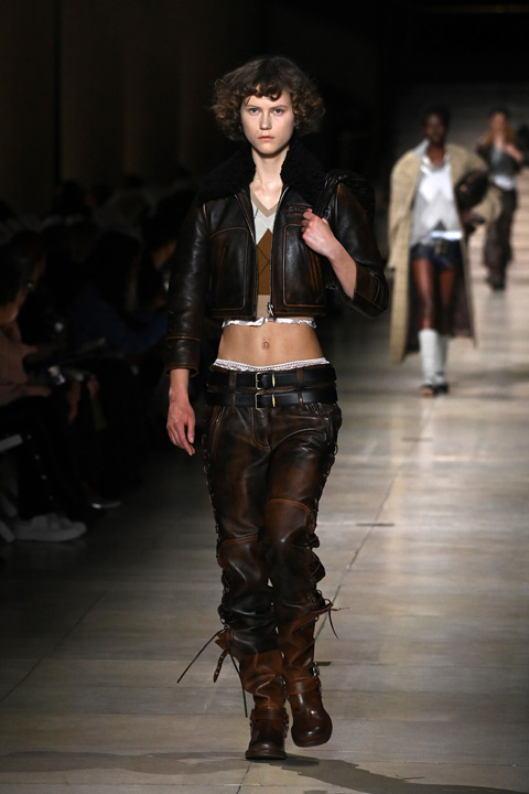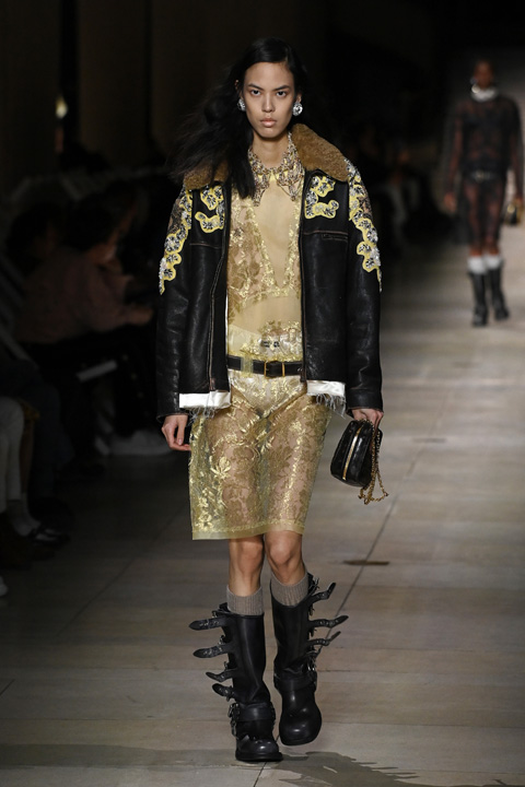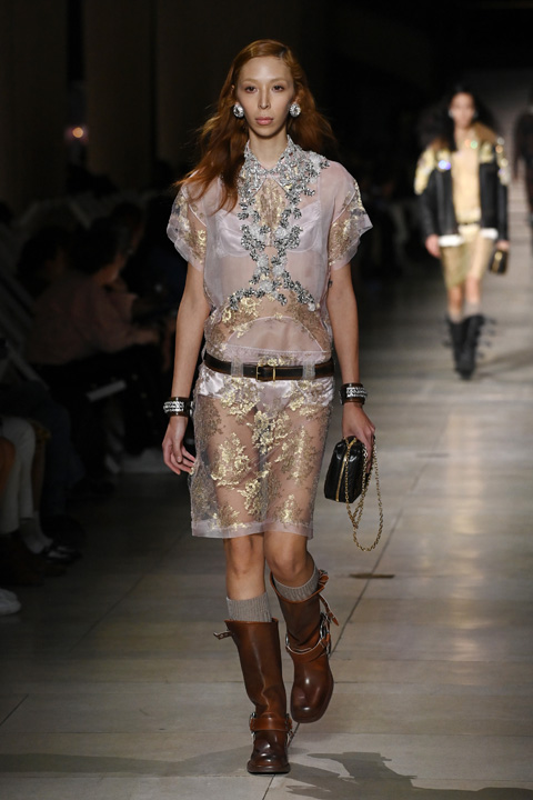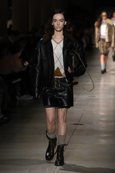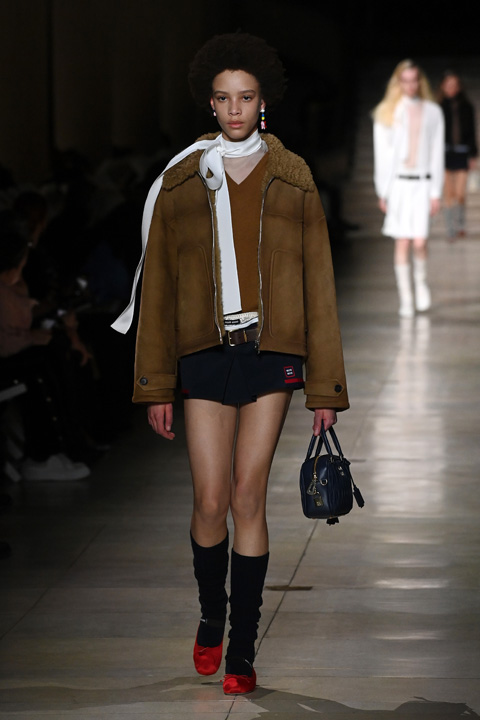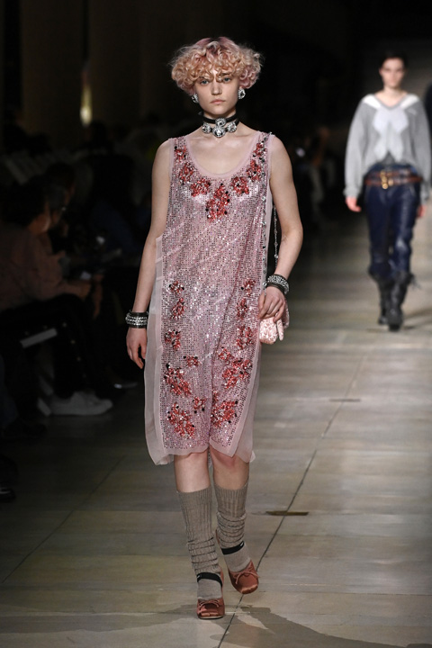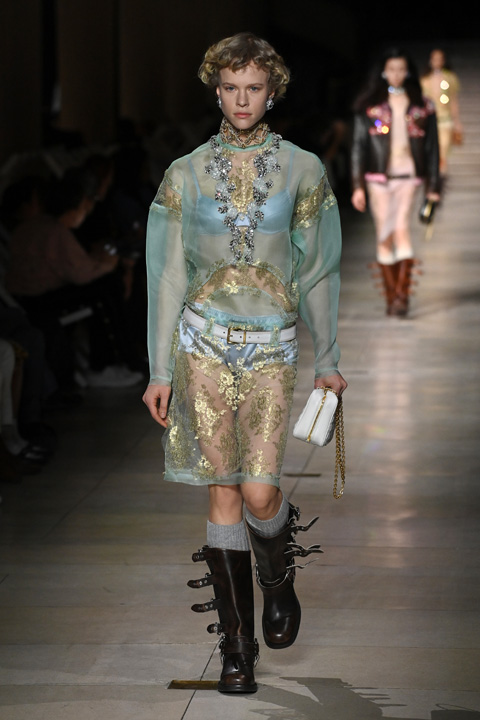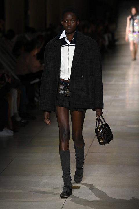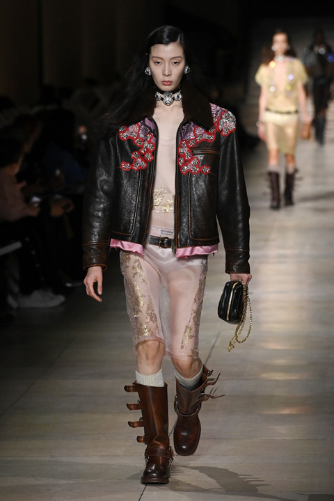 Aynı tema, yeni varyasyonlarda (yılan derisi baskılı, lekeli deri, suni kürk yakalı) ortaya çıktıkça, Miu Miu kişisinin cinsiyet açısından daha çeşitli bir ifadesi şekillendi. Her moda kızı ve annelerinin yanı sıra, erkekler de geçen sezonun kırpılmış Miu Miu örgüleri ve küçük ceketleriyle şova girdi. Miu Miu'nun feminen estetiği, büyük blazerler ve geniş paltolarla yan yana getirilerek yeni erkek giyimini tanıtmak için mükemmel bir araç olarak işlev gören bir androjenlik unsuru yaratıldı.