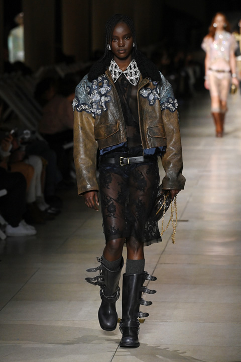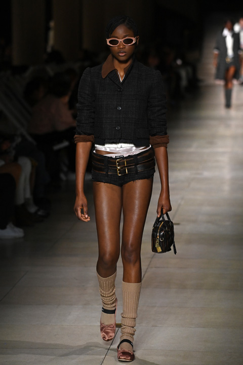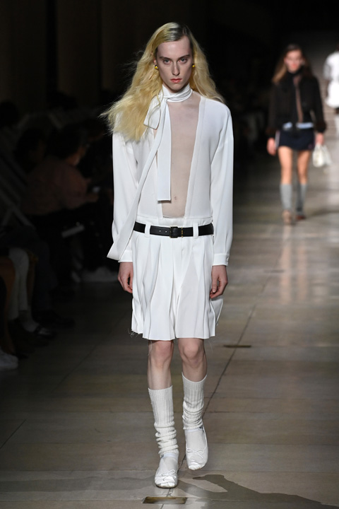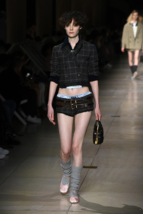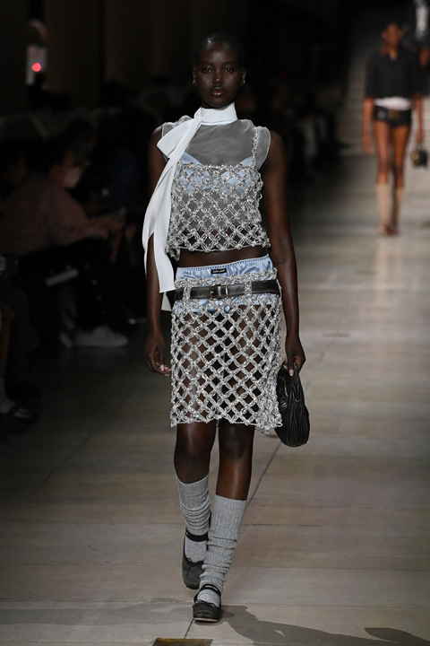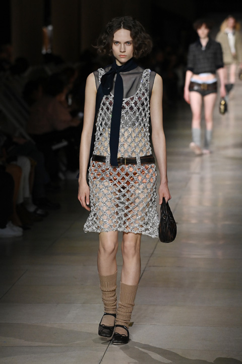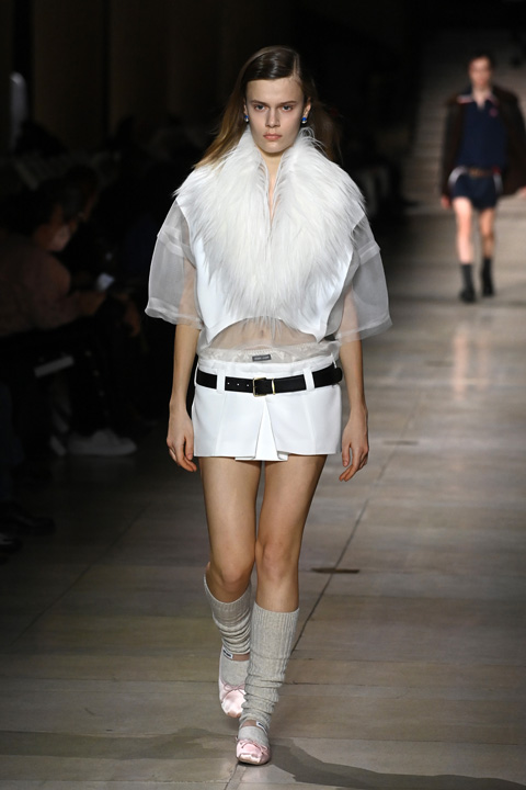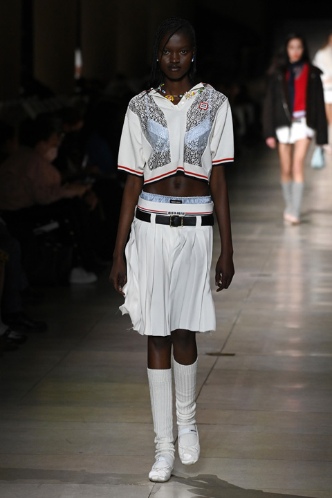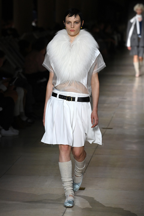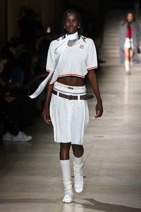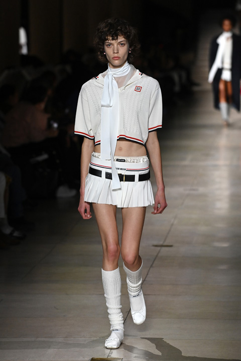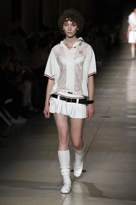 Miu Miu kızının silueti, daha az işkolik ve daha çok bir spor tutkunuydu. Geçen sezon ofis kıyafet kurallarını bozduktan sonra, gözünü tenis kortuna dikti ve şeffaf dantel süper kısa Y2K etekler ve üstleri sundu.
