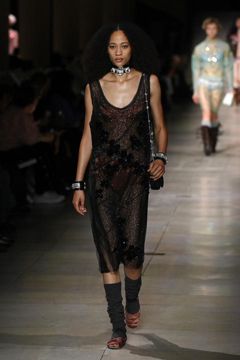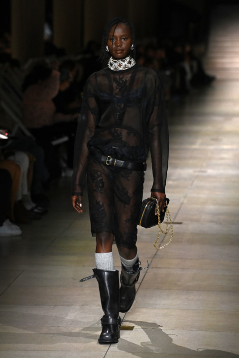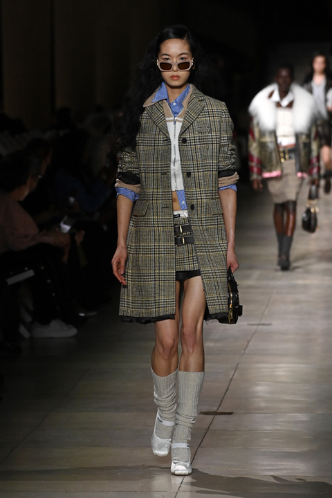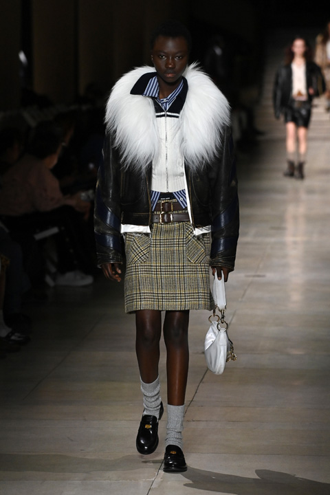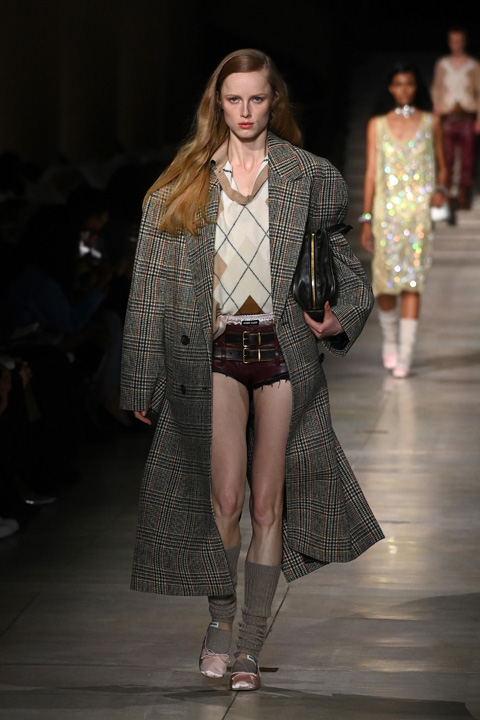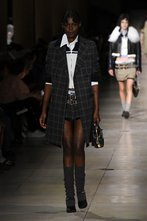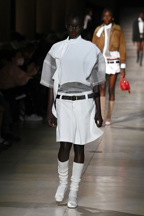 Etiketin her yerde bulunan silueti alıp 2022 sonbaharı için yeniden şekillendirmesi mantıklı. Sunum, elbette, çok ünlü eteğe kesin olarak yeni bir bakış açısıyla açıldı. Burada, küçük pileler ve daha belirgin bir bel ile beyaz renkte yapılmıştı, ipeksi logolu iç çamaşırı üstten görünüyordu. Pololarla eşleştirilmiş eteklerle birlikte silüetler, 90'lardaki bazı koleksiyonlarına kadar uzanan motifleri hatırlattı.