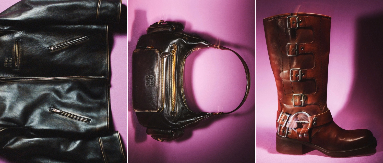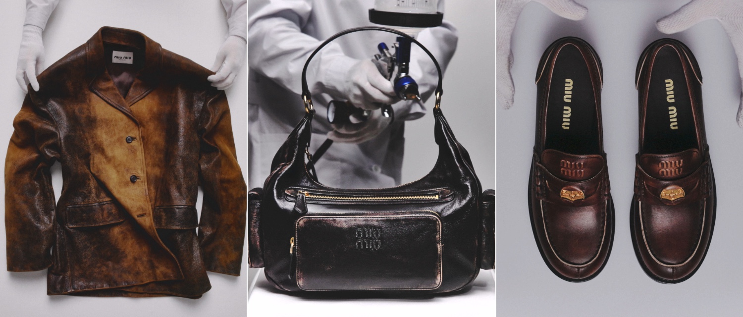 Miu Miu’nun yenilikçi yaklaşımı tam da bu noktada belirginleşiyor: Yaşlanma, bir kusur olarak değil; tasarımın aktif bir bileşeni olarak ele alınıyor. Making of Old projesi kapsamında geliştirilen bu teknikler, markanın farklı ürün kategorilerine yayılıyor. Loafer’lar, Chelsea botlar, bağcıklı ve tokalı modeller; Arcadie, Pocket ve Wander çantalar; pilot siluetli ve bomber ceketler, mikro şortlar ve daha pek çok parça bu çok katmanlı sürecin izlerini taşıyor.