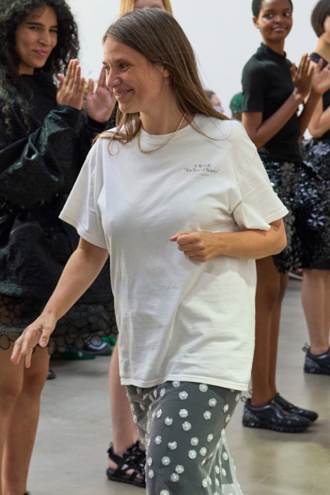 Koleksiyon yalnızca form değil renk üzerinden de bir ritim duygusu taşıyordu. Beyaz, pembe, kırmızı ve siyah tonları arasında yumuşak geçişler kuran Bahnsen, zaman zaman plastik çiçek apliklerle dokuya da oynaklık kattı. Ayrıca defilede yer alan farklı beden ölçülerine sahip modeller, çeşitlilik mesajını sessiz ama net bir şekilde veriyordu. Ayakkabılarda ise tasarımcının Asics ile sürdürdüğü işbirliğinin yeni modelleri yer aldı. Slip-on sneaker’lar koleksiyonun hafifliğini ve pratikliğini pekiştirdi.