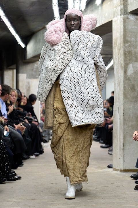 Bu sezon podyumlarda sıkça karşımıza çıkan sade kumaşlar Kawakubo’nun vizyonuyla tanınmaz hale geldi. Defile ham bezler ve jüt kumaşlarla şekillenen heykelsi siluetler üzerine kuruluydu. Dev şapkalarla tamamlanan bu katmanlı formlar bazen bir enstalasyonun bir parçasıymış hissi uyandırıyordu.