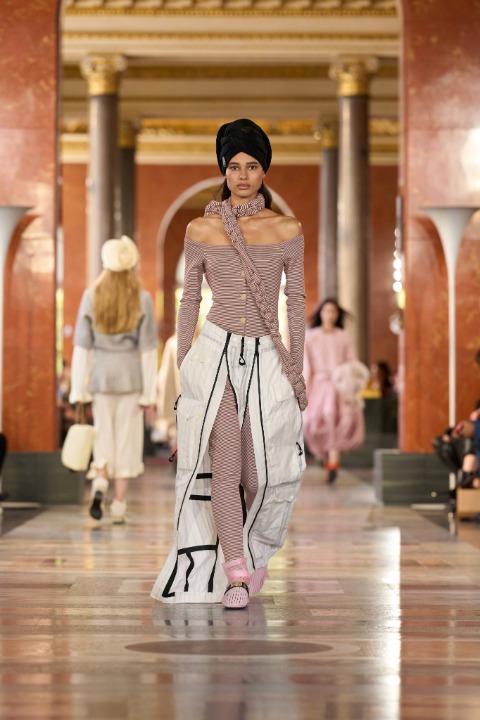 Koleksiyonda stil özgürleşmesi tasarımlarla ifade edilirken farklı form ve dokularda birçok parça gördük. Ön plana çıkan detaylarda ise sivri yakalar ve hacimli drapeler yer aldı. Markanın kült "Speedy" ve "Trunk" çantaları ise adeta tek formda buluştu. Şovun bir diğer önemli konusu ise Louvre Müzesi’nde gerçekleşmiş olmasıydı. Louvre, Fransa Kraliçesi ve XIV. Louis’nin annesi Avusturyalı Anne’in, zamanında yaşadığı yazlık daireler olarak biliniyor. Aynı metafordan ilhamla defile için çağdaş daire kurgulayan set tasarımcısı ise Marie-Anne Derville. Bu kurgulanan dairenin içinde ise sanatçı Robert Wilson’ın eserlerinden 18. yüzyılın başarılı mobilyacısı Georges Jacob’a, 1930’ların art deco tasarımcısı Michel Dufet’nin koltuklarından 19. yüzyılın seramik sanatçısı Pierre-Adrien Dalpayrat’nın heykellerine ve kendi tasarladığı mobilyalara kadar uzanan bir seçki yer aldı. Kısacası Louis Vuitton sadece yarattığı siluetlerde değil, set tasarımıyla da bütünsel bir dünya yarattı.