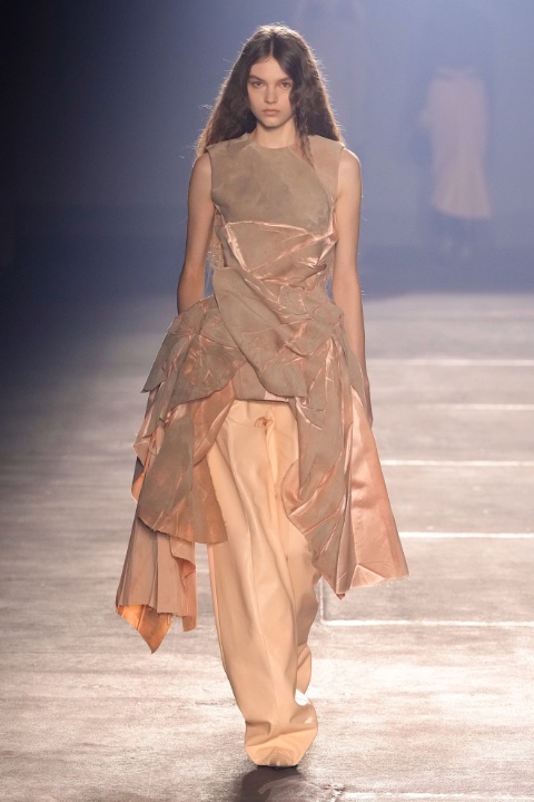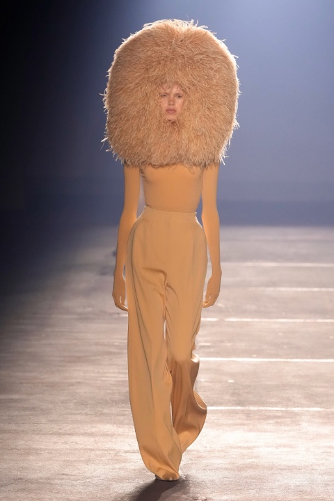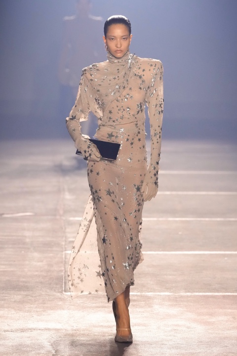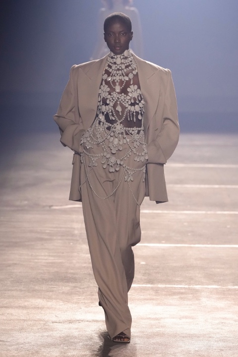 Şov, moda dünyasının eğlenceyle moda arasındaki sınırlarını yeniden sorgularken Freitas, Thierry Mugler’ın mirasına hem saygı duruşunda bulundu hem de yeni bir yaklaşımla yola çıktığını gösterdi. Kum ve bej gibi sakin tonlar ile güçlü omuzlar, ince bel siluetleri, kitlelerin Mugler denildiğinde aklına gelen ikonik siluetleri tekrar hatırlattı. Vinil eteklerden gövdeyi saran transparan body’lere; mid-century detaylardan 40’lar stiline göz kırpan tüy işlemelere kadar pek çok sürpriz vardı.