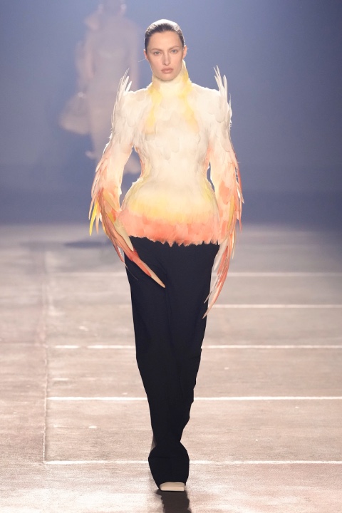 Gece kıyafetleri kadar sade parçaların da yer aldığı koleksiyonda kesim netliği ve terzilik öne çıktı. Desenler, parlak kumaşlar ve tüy detaylarıyla Mugler’ın dramatik genetiği korunurken siluetlerin son derece çekici olması ve materyal oyunları koleksiyonda markanın ruhunu yansıttı.