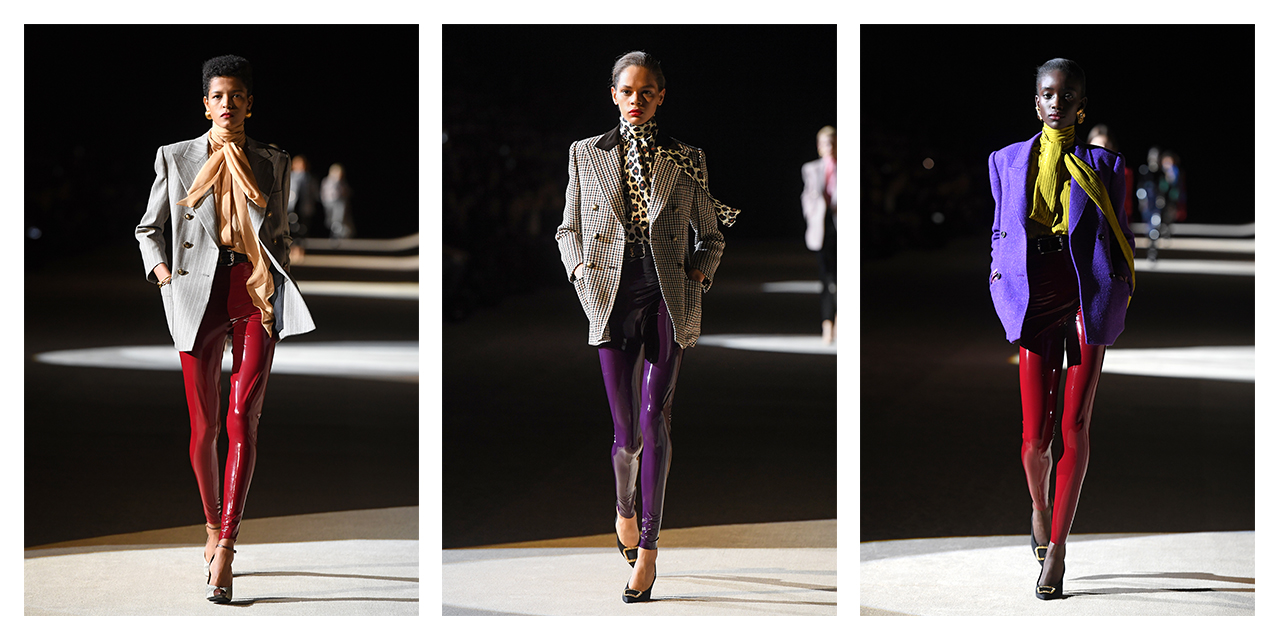 Yüksek belli taytlar, pantolonlar, etekler, elbiseler ve botlarda görülen parlak lateks kumaşları, kontrast yaratan blazer ceketler ve kalem etekler ile eşleştirildi. Lateks kumaşının düşündüğümüzden daha çok çeşitlilik gösterdiğini kanıtlayan Saint Laurent defilesinde öne çıkan renkler arasında, morlar, pembeler ve hardal sarıları yer aldı.