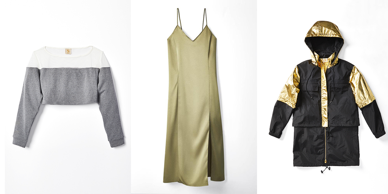 Weekend Cropped Sweatshirt, $60 SERENA serennawilliams.com, Palm Beach Slip Dress, $125 SERENA serenawilliams.com, Knockout Metallic Jacket, $215 SERENA serenawilliams.com