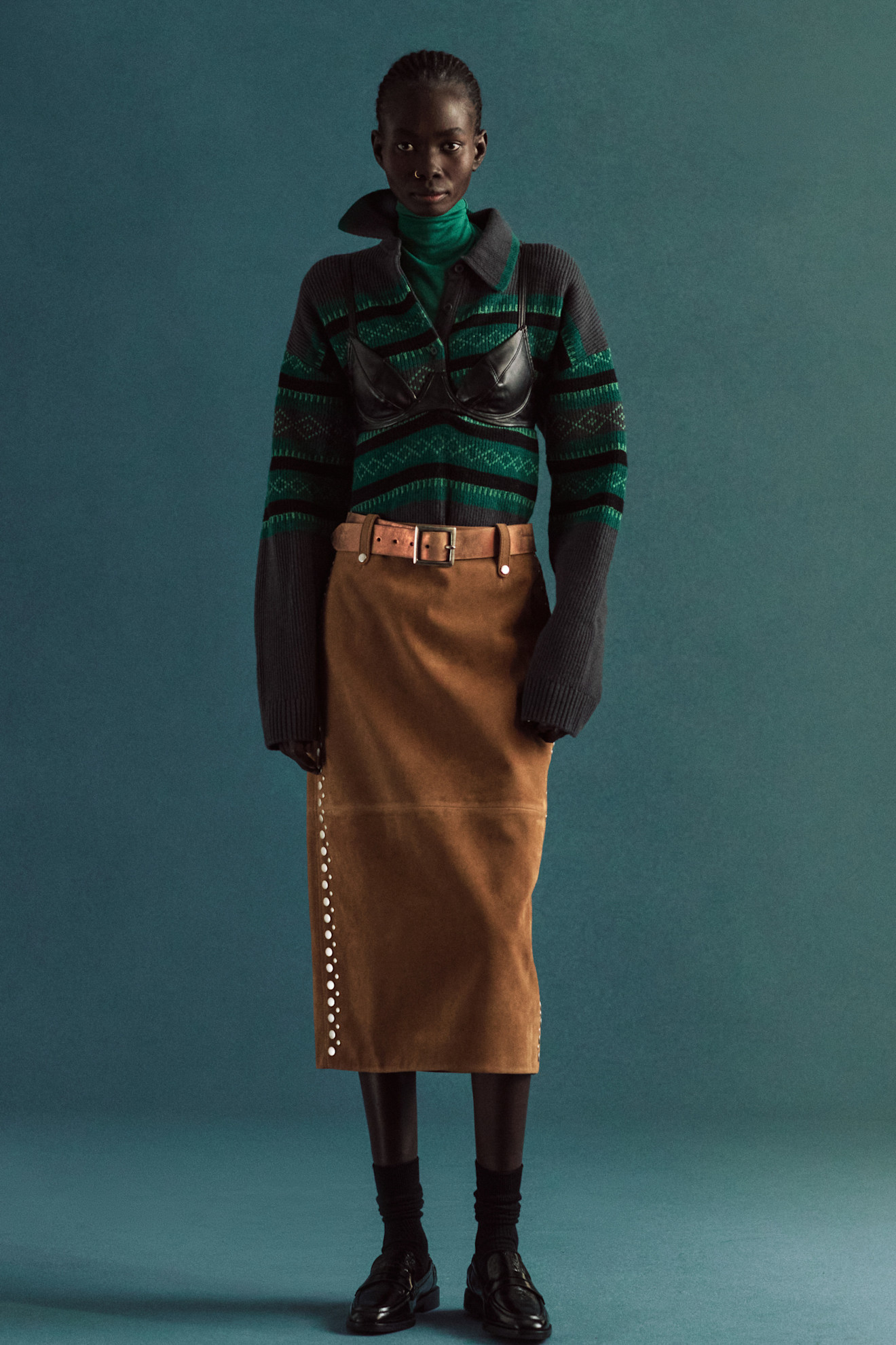 Tasarımları zenginleştiren derin tonlar farklı form ve dokularla yerlerini belli ederken süetler, parlak deriler de bu durumun işbirlikçilerinden. Sportif atmosferlerden uzak, daha vurucu görünümlerle karşılaştığımız koleksiyon midi düz kesim eteklerin her sezonun anahtar parçalarından olacağının işaretini veriyor.