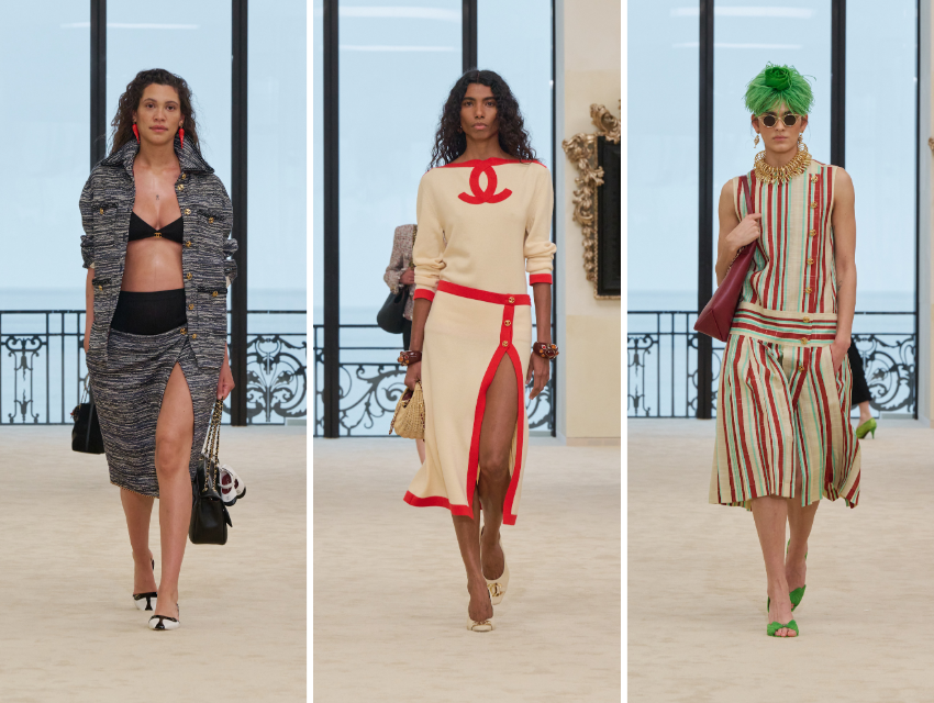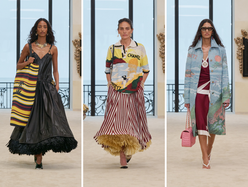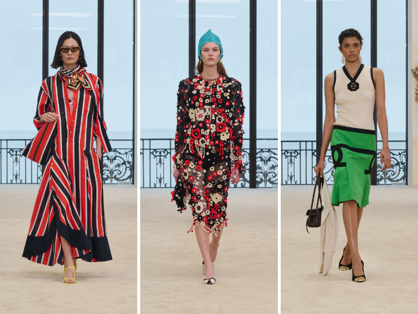Koleksiyonun çıkış noktası: 1920’lerin Chanel silüetleri. Spor giyim, işçi üniformaları ve denizci referanslarının birleşiminden doğan bu dil, Blazy’nin yorumunda daha hafif ve akışkan bir hale geliyor. Çizgiler koleksiyonun ana motiflerinden biri; Bask bölgesine özgü tekstillerden ilham alan desenler, denizci trikoları ve grafik eteklerle birlikte kullanılıyor. Blazy baskın desenleri bir arada kullanmaktan çekinmiyor.