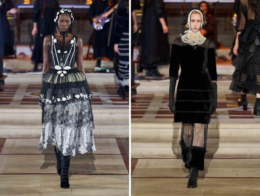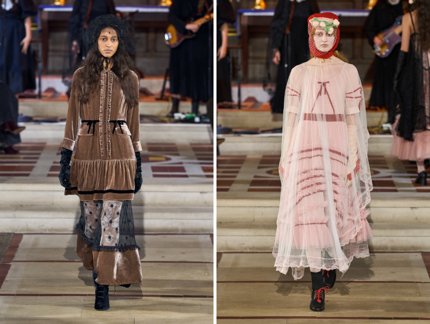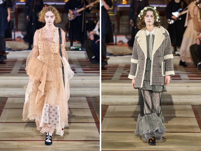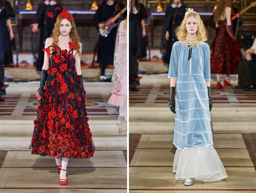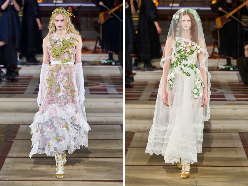 İkinci bölümde ton koyulaşıyor. Tül ve dantel katmanlar artıyor. Puantiyeli elbiseler, saydam kumaşlar ve çiçek aplikeleri daha dramatik bir hava yaratıyor. Finaldeki beyaz gelinlik görünümü ise koleksiyonun hikayesini tamamlıyor.