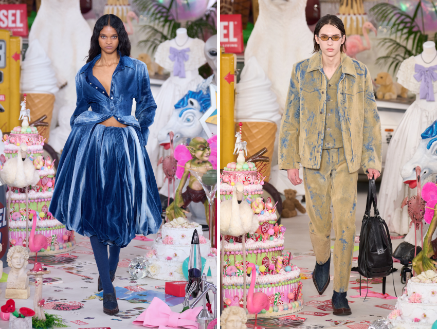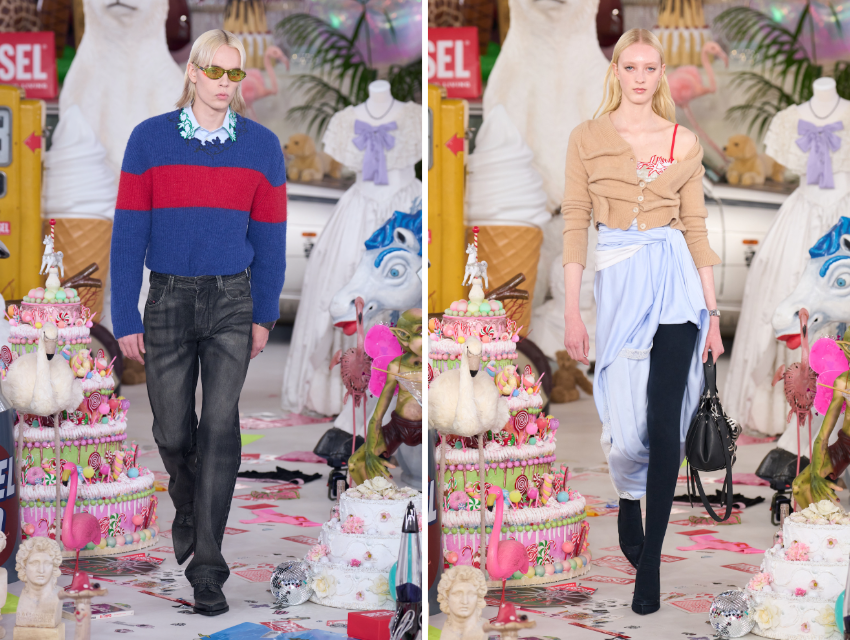 Defilenin set tasarımı da en az koleksiyon kadar güçlüydü. Markanın arşivinden ve dünya ofislerinden toplanan 50 bini aşkın kampanya aksesuarı, davetiyeler, hatıralar gibi objeler, mekanın merkezinde bir enstalasyon olarak sergilendi. Şişme oyuncaklardan Noel figürlerine, markalı iç çamaşırlarından peluşlara kadar uzanan bu seçki, Diesel’in yıllar içinde inşa ettiği kültürel evrenin somut bir yansımasıydı. Bu yaklaşım, markanın rave kültürüyle ve ironik tavrıyla kurduğu bağı yeniden hatırlatıyor. Diesel, lüks ile kitsch’i, ciddiyet ile eğlenceyi aynı zeminde buluşturuyor.