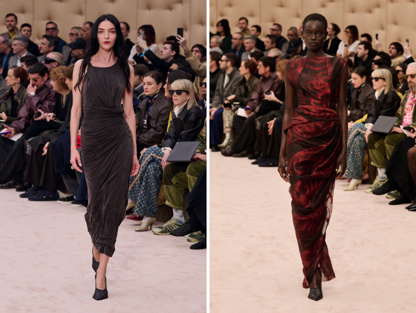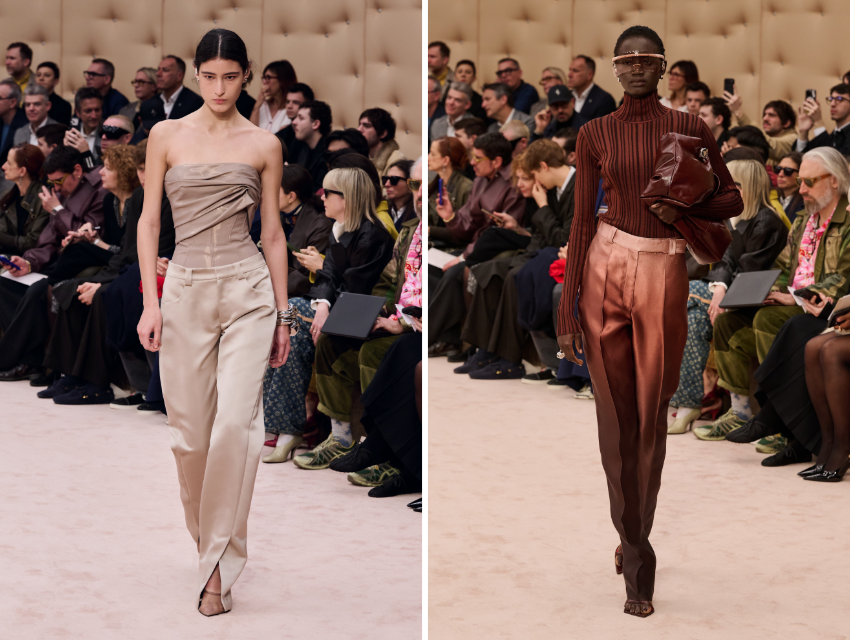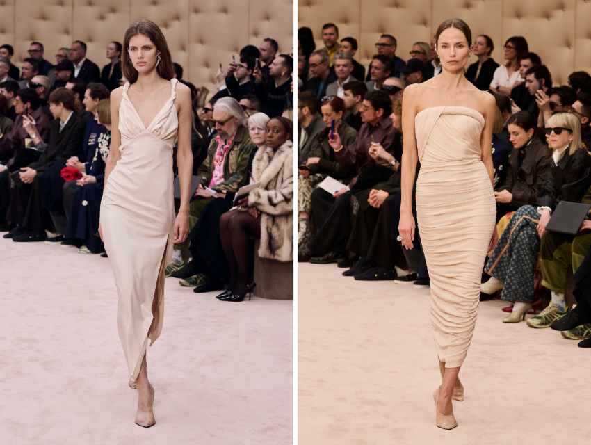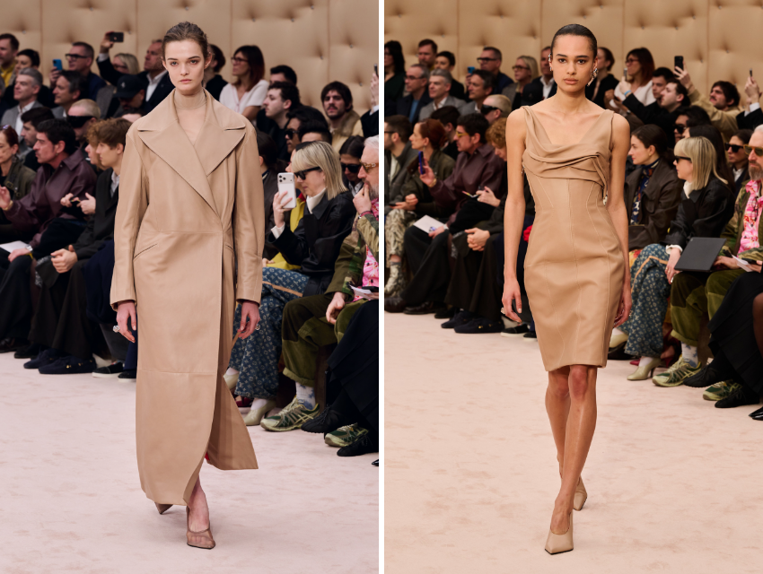 Defile, ortasında oval bir su havuzu bulunan bir mekanda gerçekleşti. Koleksiyonun dokusal atmosferini zenginleştirmesi için tavandan su damlaları düşüyordu. Defilenin açılışında çıkan açık tonlu deri görünümler, diz hizasında bir palto, takım elbise, drapeli uzun elbise, markanın ikonik kırmızısını astar detaylarında saklı biçimde taşıyordu. Nude palet, derinin yumuşaklığıyla birleşerek tene yakın bir etki yarattı.