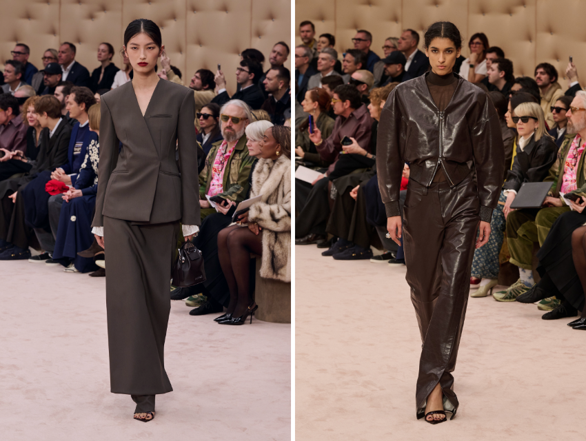Dış giyimde oversize deri montlar dikkat çekti. Yosun yeşili, kahverengi ve siyah gibi koyu tonlarda yün takımlar daha net bir silüet sundu.