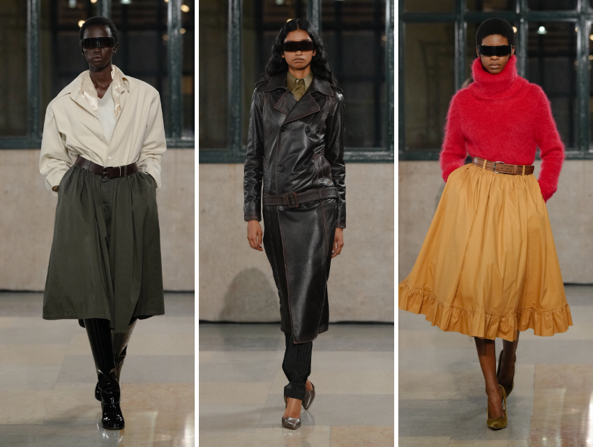 Kaban etek uçları yukarı kıvrılıp çıtçıtlarla sabitlenmişti. Kalem etekler arkası açık önlük formundaydı, uzun tişörtlerin üzerine giyilerek hem katman hem de mesafe yaratıyordu. Bu detaylar, dekonstrüksiyonu düşünsel bir araç olarak konumlandırıyordu.