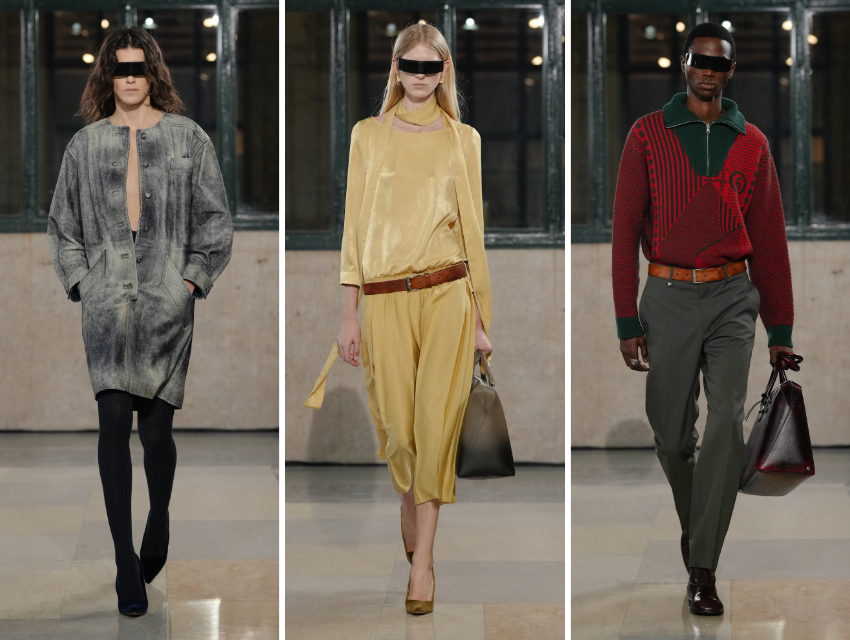 Denim koleksiyonun merkezindeydi. Erkek görünümlerde bel bantlı, üst katmanı bilinçli biçimde çözülmüş denim pantolonlar, kadınlarda ise yüksek belli ve paçaları daraltılmış, 1980’leri hatırlatan kesimler vardı. 80ler referansı yalnızca formda değil, hacimli fırfırlı eteklerde ve flanel gömlek–balıkçı yaka görünümlerinde de hissediliyordu. Ancak bu nostalji romantize edilmeden, bugünün temposuna uyarlanmıştı.
