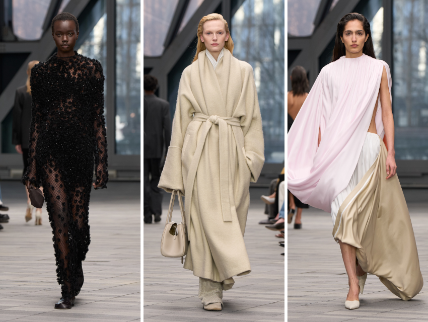Saten elbiseler ve kadife slip dress yorumları daha zanaatkar bir yaklaşım taşırken, üç boyutlu çiçek aplikeli transparan ağ örgü tasarımlar koleksiyonun romantik tarafını işaret ediyor. Yine de asıl ikna edici anlar, sadeliğin en net hissedildiği görünümler.