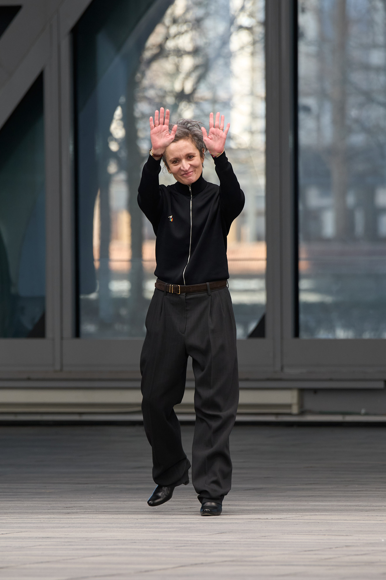 Leoni’nin 1976 tarihli orijinal podyum denim pantolonunu yeniden üretmesi, koleksiyonun en güçlü hamlelerinden biri. Arka cepteki deri patch üzerinde yer alan el yazısı logo, nostaljiyi doğrudan bugüne taşıyor. Bu logo, siyah saten bir smokin üzerine giyilen deri bomber’da tekrar karşımıza çıkıyor; Leoni’nin terzilik becerisi burada net biçimde hissediliyor.