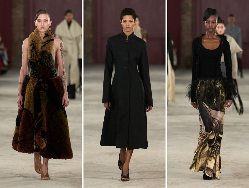 Scott’ın güçlü terziliği bu sezon daha görünür. Koyu kareli bir trençkot zamansız bir siluet sunarken, etek-pantolon hibritleri ölçülü bir yenilik katıyor. Fırçalanmış paltoların yakalarındaki kıvrımlı viskoz detaylar kürkü andırıyor fakat malzeme seçimi bilinçli ve hayvan dostu.