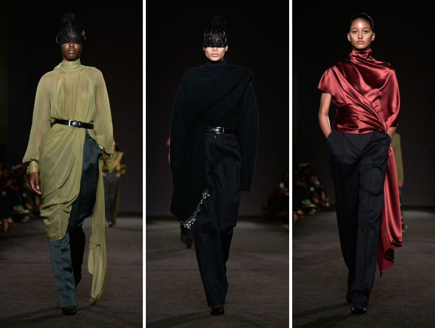 Koleksiyondaki drapeler, Nepal’deki şifon sarilerin dans ederken yukarı toplanma hareketinden esinlenmiş. Akışkan formlar kontrollü bir zarafetle şekilleniyor. Gözleri örten dar dantel başlıklar tasarımcının inancından ilham alıyor. Bu parçalar mistik bir atmosfer yaratırken koleksiyonun sorusunu daha da derinleştiriyor: Ev, gelenek midir, inanç mıdır, yoksa bedenle taşınan bir ritüel mi?
