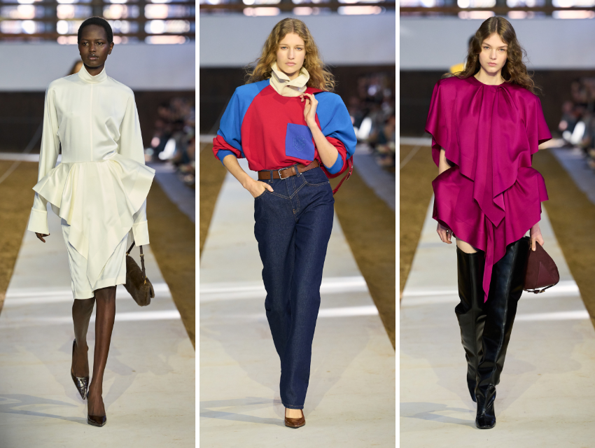 Koleksiyonun silüet yelpazesi oldukça genişti: ultra-feminen uzun slip elbiseler, feminen günlük parçalar, daha maskülen polo tişörtler ve anoraklar, ince veya cömert kesimli takımlar… Orta tonları tercih edenler için de yeterince seçenek vardı: Oversize dış paltolar, şal yakalı ceketler, el işçiliği detaylı uzun kollu elbiseler ve sıvı gibi görünen payetli gümüş halterler, özenle kesilmiş siyah pantolonlarla tamamlanıyordu.