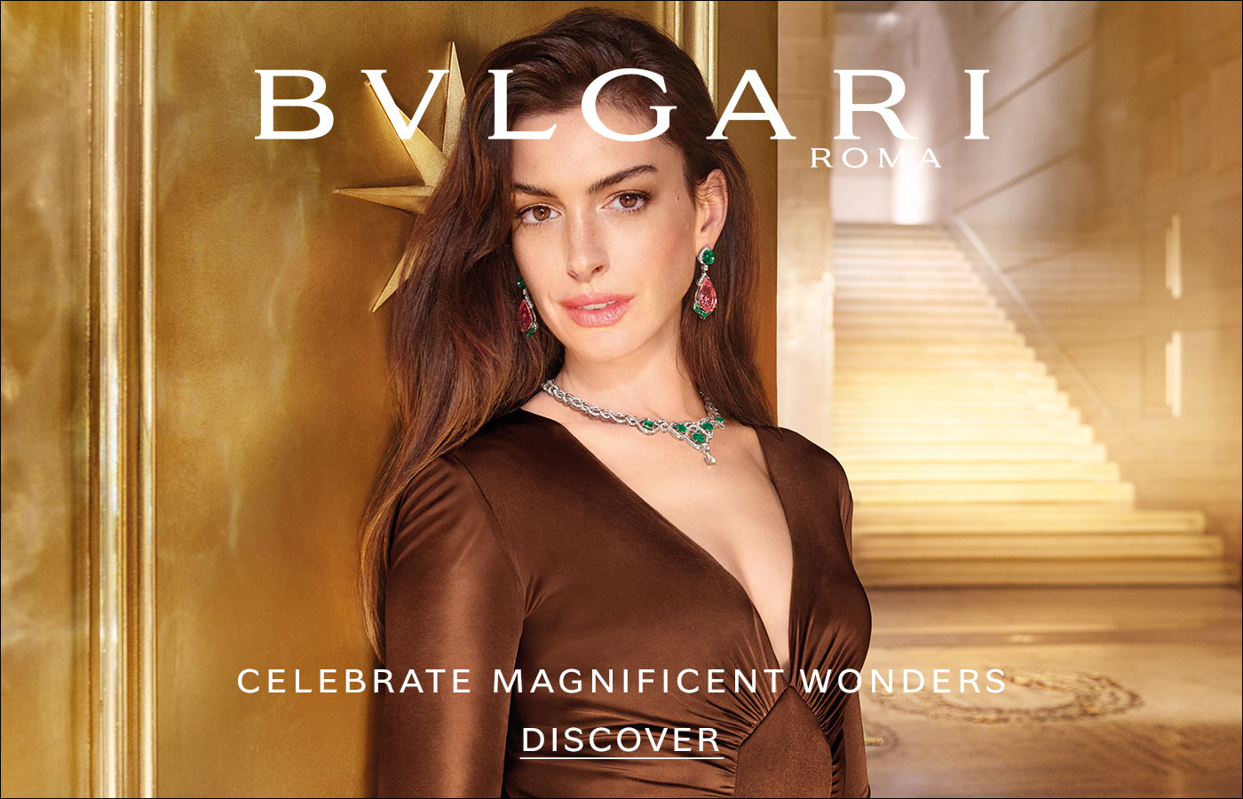 Anne Hathaway, Bulgari Yılbaşı Kampanyasının yıldızı olan ilk global Marka Elçisi olarak ışıltılı karizmasını Bulgari’nin anında tanınan Romalı özüne göndermelerle dolu, zamanın ötesinde bir boyuta taşıyor. Ebedi Şehrin mimari başyapıtlarından ilham alan çok kemerli bir koridor bir perspektif değişikliğini simgeliyor ve sonsuz bir harikalar yoluna girişi temsil ediyor. Sekiz köşeli yıldızlar sihirli ve mucizelerle dolu bir yola işaret ediyor. Bulgari kodlarının en sembolik imzalarından biri olan renkli değerli taşlardan oluşan bir şelale insan duygularının farklı yönlerini çağrıştırıyor. Ve nihayet Romalı mücevher markasının ikonik sembollerini içeren Serpenti adeta sihirle hayat bularak mucizenin her yerde bulunabileceğini hatırlatırken markanın imzasını taşıyan hediye kutusu da unutulmaz bir Yılbaşı Sezonunun vaadi haline geliyor.
