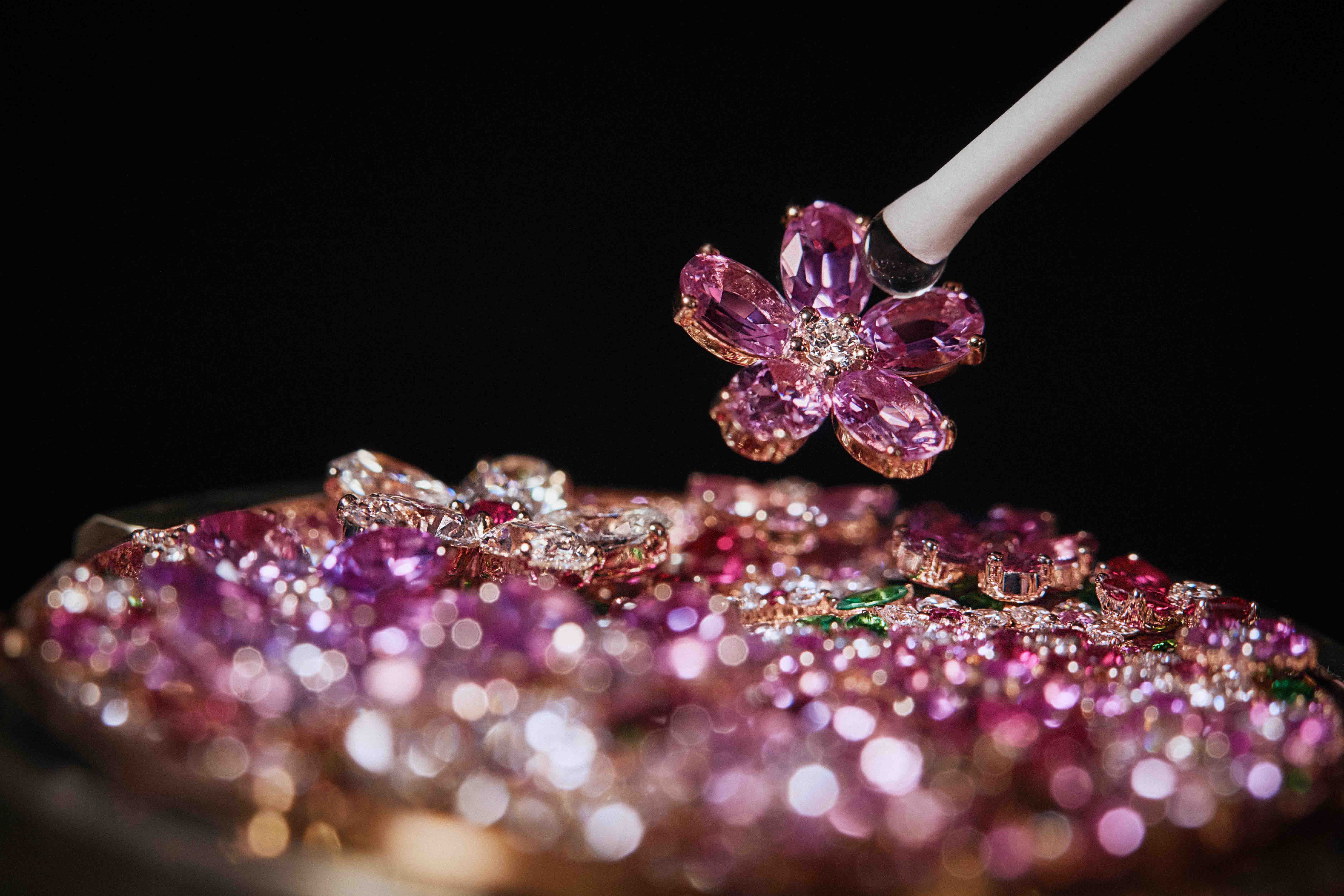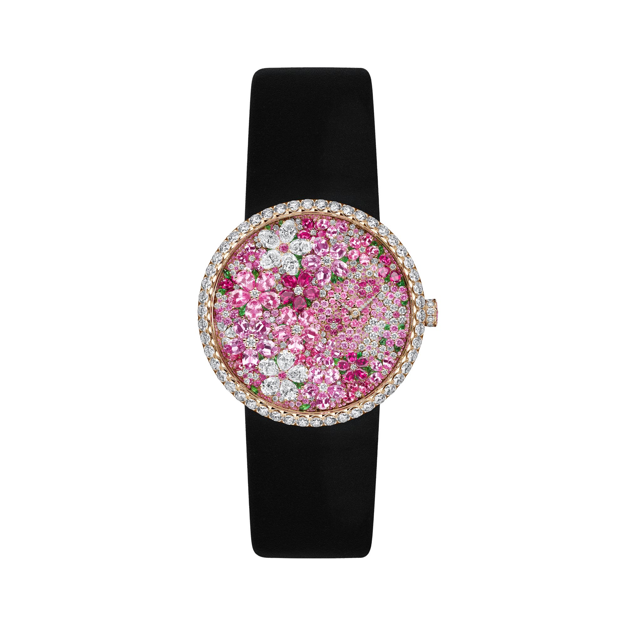 Pembe altın kadran, tamamen taşlarla kaplanarak ışıkla her açıdan farklı bir etkileşim kuracak şekilde tasarlanıyor. Yakut, pembe safir, pırlanta ve tsavorite granatların bir araya gelişi, tonların kontrollü geçişi sayesinde organik ama aynı zamanda bilinçli bir düzen hissi yaratıyor. Bu düzen, saatin yüzeyinde sürekli hareket eden bir derinlik algısı oluşturuyor.